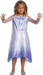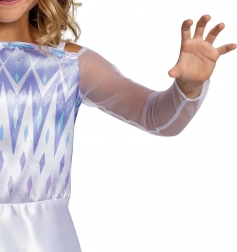 Het lijfje met geometrische ijspatronen en de subtiele kleurovergang van de rok naar paars-blauwe tinten creëren een authentiek “Frozen”-effect waar kinderen dol op zijn.