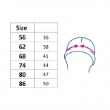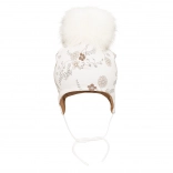 Stijlvolle 2-delige set voor meisjes New Baby Special One – een zacht mutsje met oortjes en striklint onder de kin en een bijpassende driehoekige nekwarmer. Biedt warmte en comfort in koud weer, heeft een zachte voering, een grote pluizige pompon en een subtiele bloemenprint. De nekwarmer heeft twee sluitingsposities voor een perfecte pasvorm.
