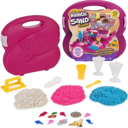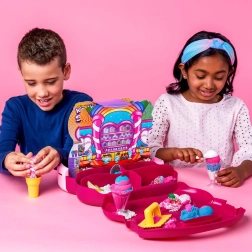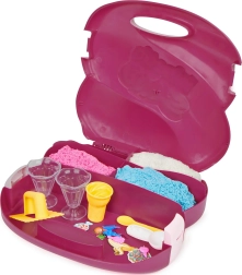 De Ice Cream Station-set in een stevige draagkoffer bevat 3 kleuren zand (totaal 680 g) en diverse tools: bekertjes, schepjes, lepeltjes en vormpjes voor realistische desserts. Perfect voor thuis en onderweg – alles heeft zijn plek en na het spelen is het snel opgeruimd.
