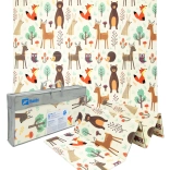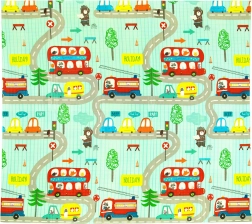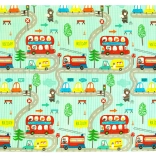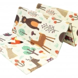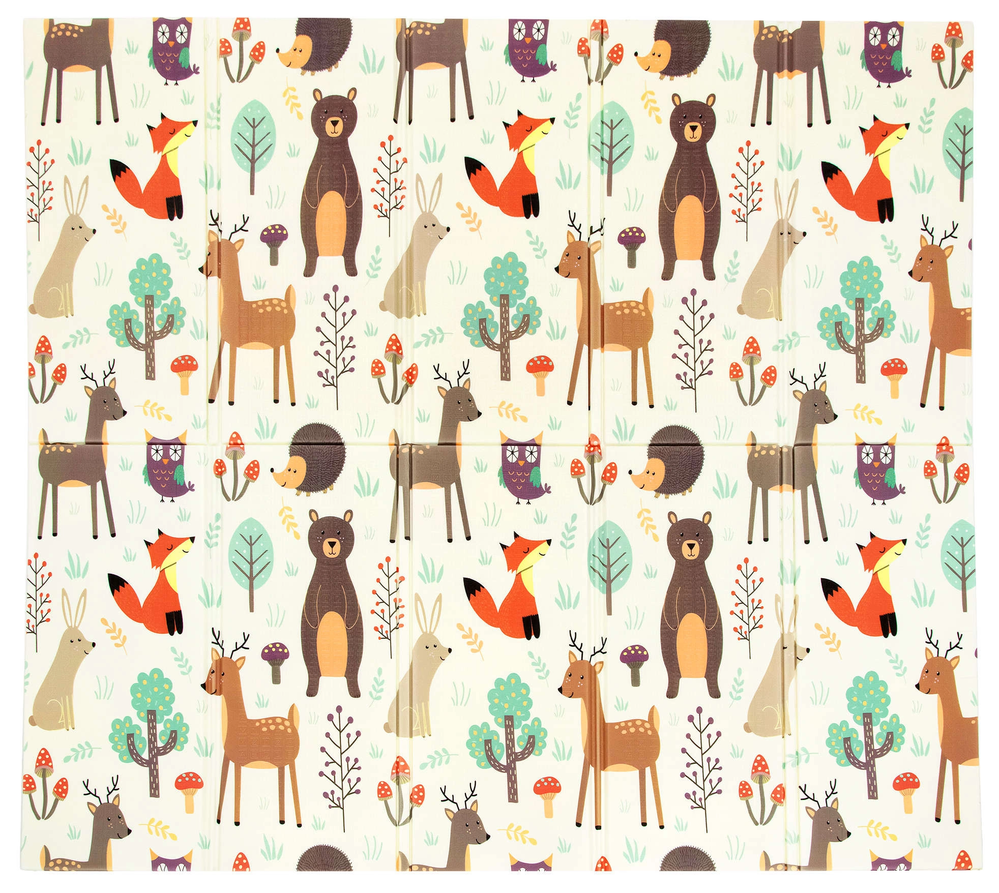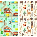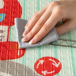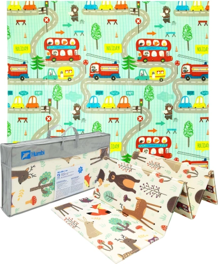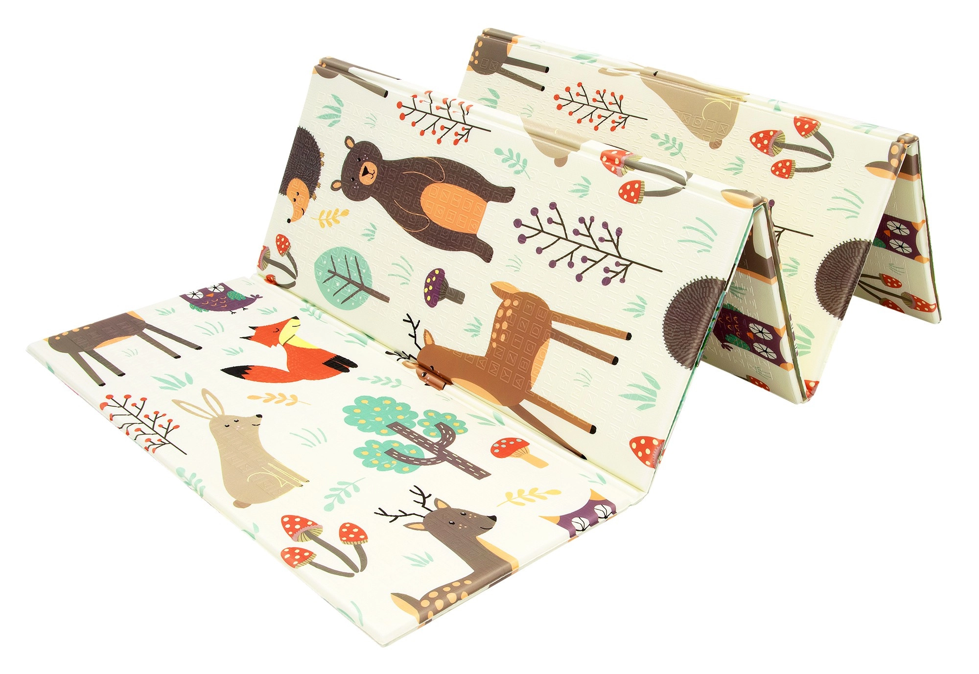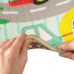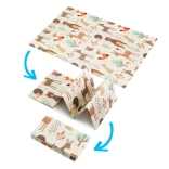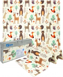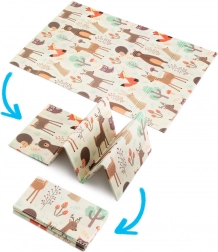 De mat is dubbelzijdig: aan de ene kant zachte motieven van bosdieren, aan de andere kant vrolijke kleurrijke straatjes. Hij is gemakkelijk op te vouwen tot een compact formaat, licht en dankzij de ritstas met handgrepen neem je hem mee naar de woonkamer, kinderkamer, tuin of picknick. Het waterdichte oppervlak veeg je eenvoudig af met een vochtige doek – een hygiënische oplossing, ook geschikt voor mensen met een allergie.