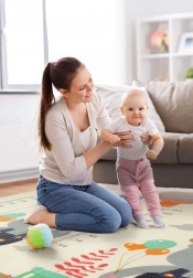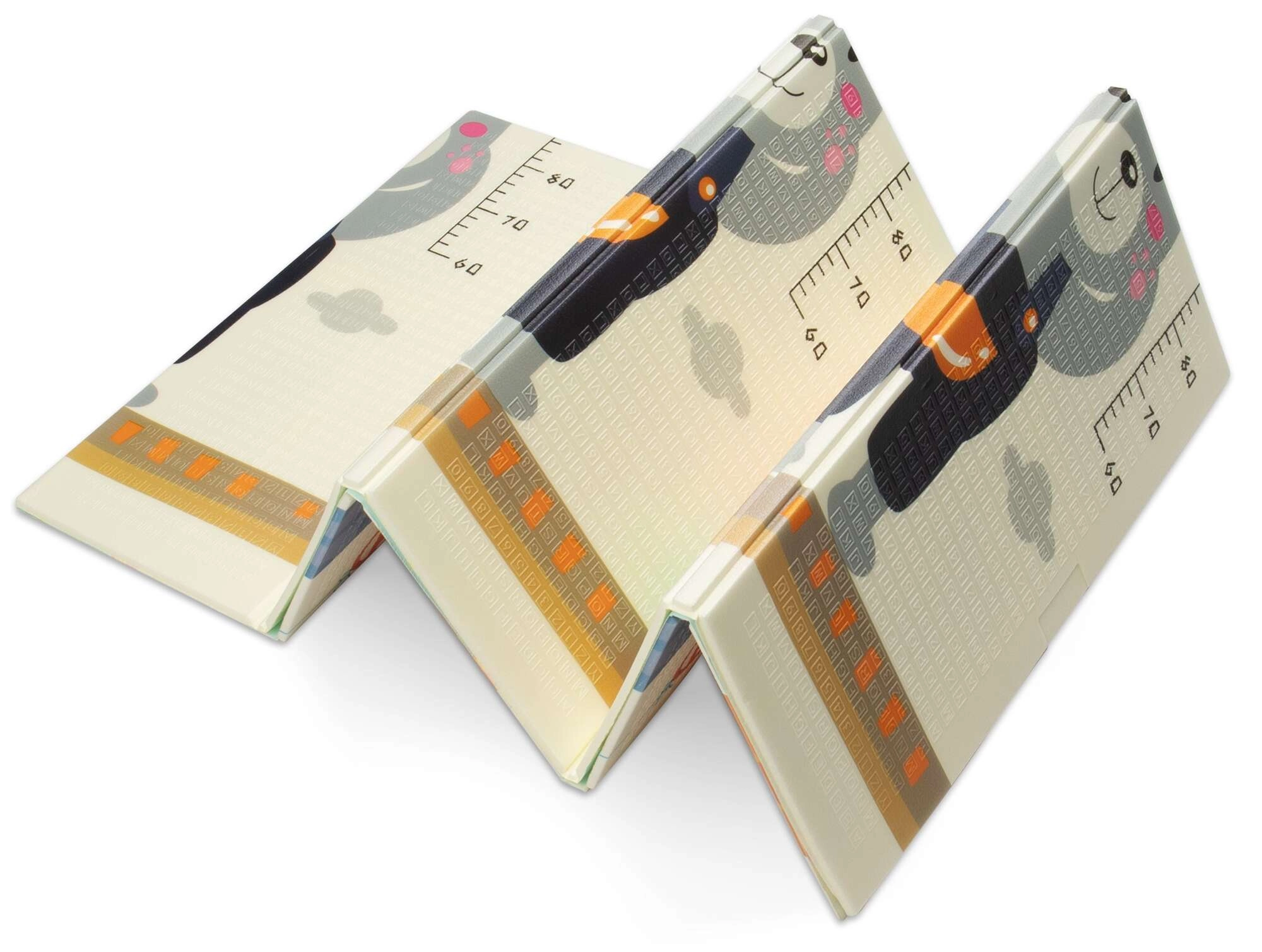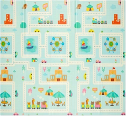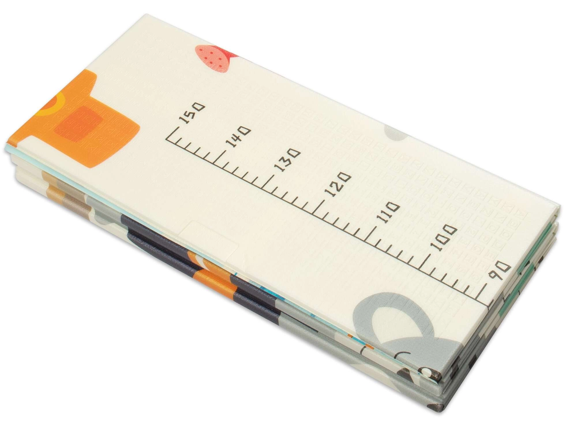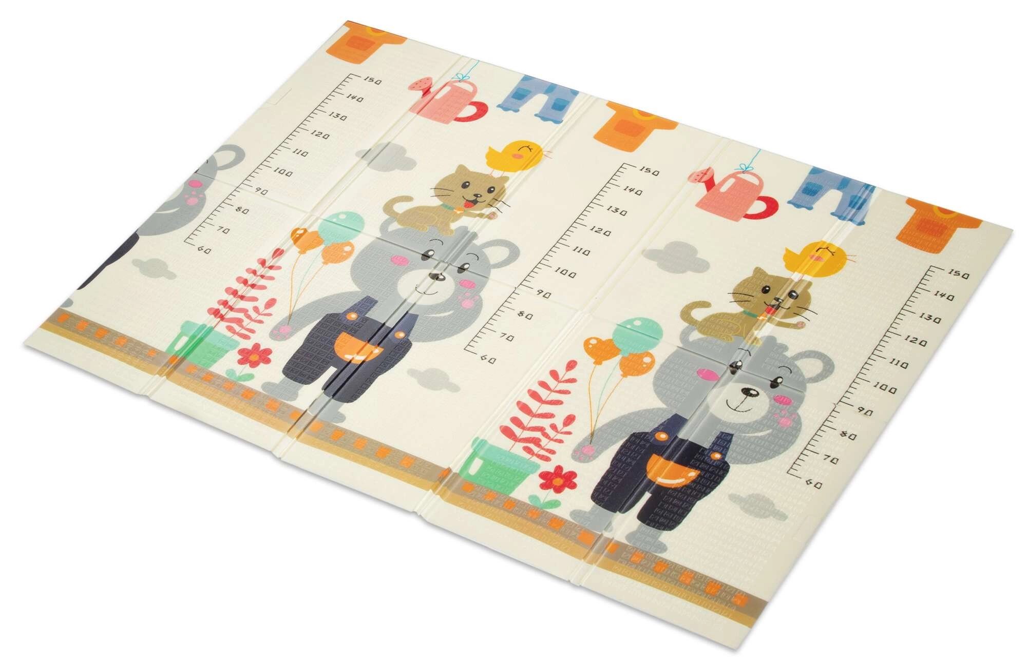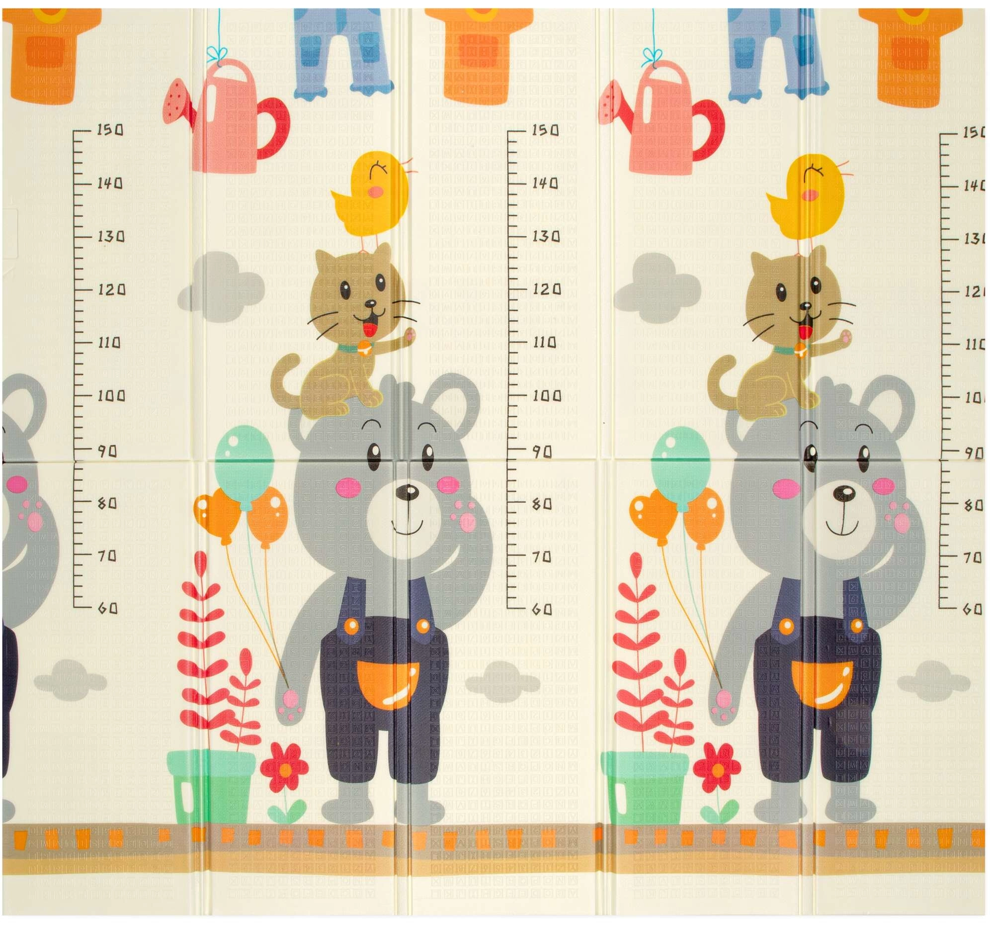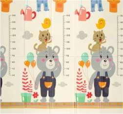 Eén zijde met schattige dieren en een meetlat om de groei te volgen, de andere met straatjes en autootjes om de fantasie tijdens het spelen te stimuleren.