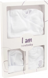 Stijlvolle en zachte 3-delige babyset NEW BABY I AM, ideaal voor in het ziekenhuis en voor de eerste maanden thuis. Bevat een doorknoopromper met lange mouwen, halfhoge voetbroek met zachte tailleband en een comfortabele muts. Gemaakt van 100% katoen voor maximaal comfort en mild voor de gevoelige babyhuid.