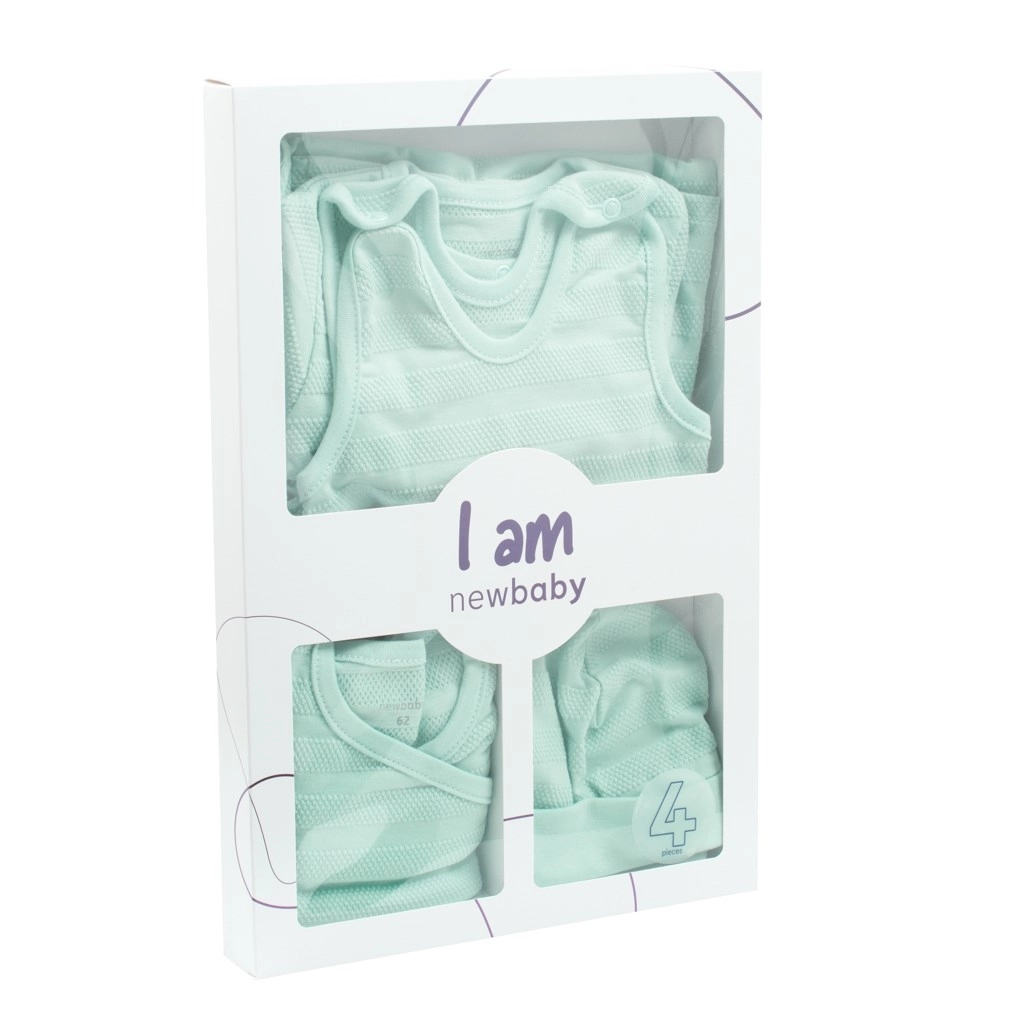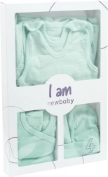 Deze mintkleurige set NEW BABY I AM is een ideale keuze voor in de kraamkliniek en de eerste levensmaanden. Dankzij doordachte pasvormen en sluitingen met drukknoopjes kan de baby gemakkelijk worden aangekleed en verschoond zonder te storen. De aangename katoen zorgt voor de hele dag comfort en ademend vermogen, terwijl het aantrekkelijke dessin de outfit een unieke look geeft.