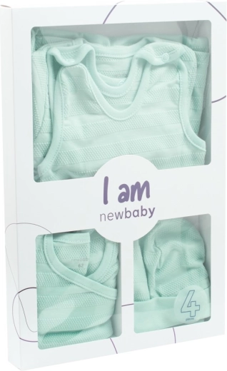 Schattige 4-delige newborn set voor de kraamkliniek NEW BABY I AM in mintkleur, gemaakt van 100% zachte katoen die mild is voor de gevoelige babyhuid. De set bevat een romper met lange mouwen met drukknoopjes over de hele lengte, boxpakje met sluiting op de schouders en tussen de beentjes, een jasje met drukknoopjes en een mutsje met bredere boord dat goed blijft zitten en niet knelt.