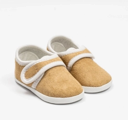 Stijlvolle en functionele New Baby slofjes in het bruin, ontworpen voor het comfort van pasgeborenen. De praktische klittenbandsluiting maakt aan- en uittrekken gemakkelijk, de slofjes sluiten goed aan op het voetje en dankzij de ruimere binnenruimte worden tenen en spieren niet belemmerd.