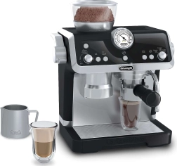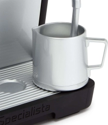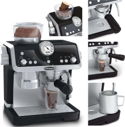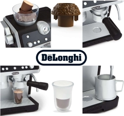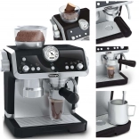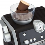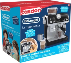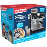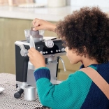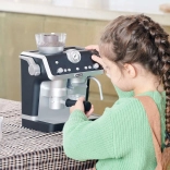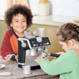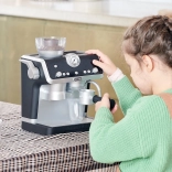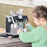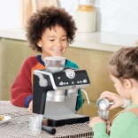 Deze moderne kinderkoffiemachine in een elegante zwart‑witte combinatie bootst een echte halfautomatische espressomachine trouw na. Kinderen kunnen bonen “malen” in het bovenste reservoir, de hendel (portafilter) vastklikken, op de knoppen drukken en zien hoe de “koffie” in de glazen stroomt. Voor cappuccinoliefhebbers is er een stoompijpje met realistische geluiden voor het opschuimen van “melk”.