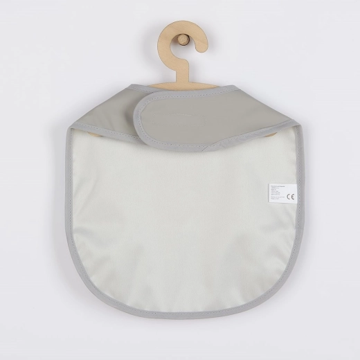 Praktische kinderslab NEW BABY in grijs beschermt kleding betrouwbaar tijdens het eten en spelen. Gemaakt van licht en zacht materiaal, makkelijk af te vegen en te wassen, met comfortabele klittenbandsluiting en een praktische dubbele laag zak.