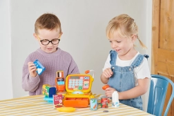 De handscanner geeft een kort piepje bij het “scannen” van producten en de kaartlezer simuleert een betaling. Kinderen oefenen zo de twee meest voorkomende betaalmethoden in de winkel.