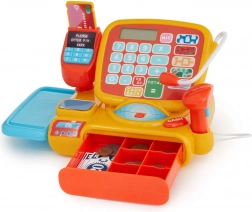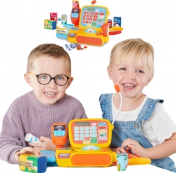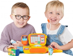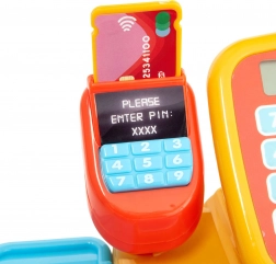 Inclusief uitgebreid accessoirespakket: munten en bankbiljetten, betaalkaart, kartonnen doosjes, “melk”, twee imitatieblikjes en imitatie citroen, wortel en brood. De uitschuifbare kassalade heeft vakken voor overzichtelijk sorteren van geld. De kassa wordt ingeschakeld met de ON/AC-knop op het rekenmachinetoetsenbord.