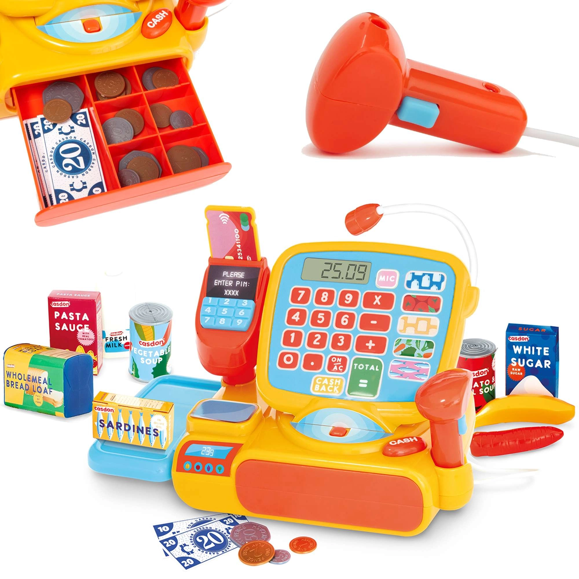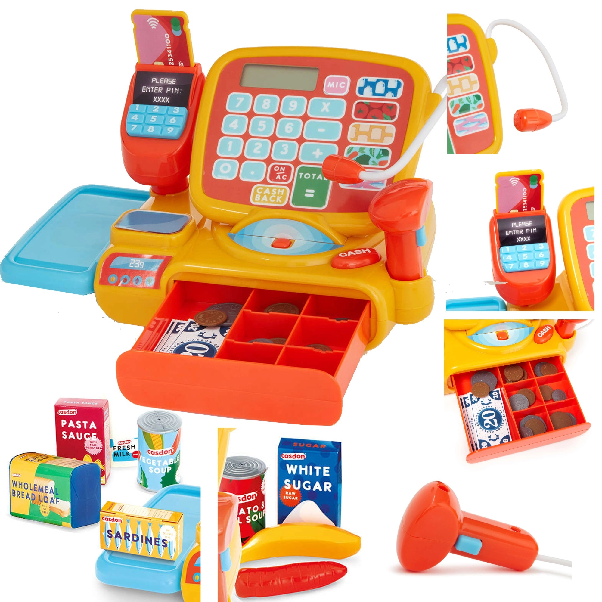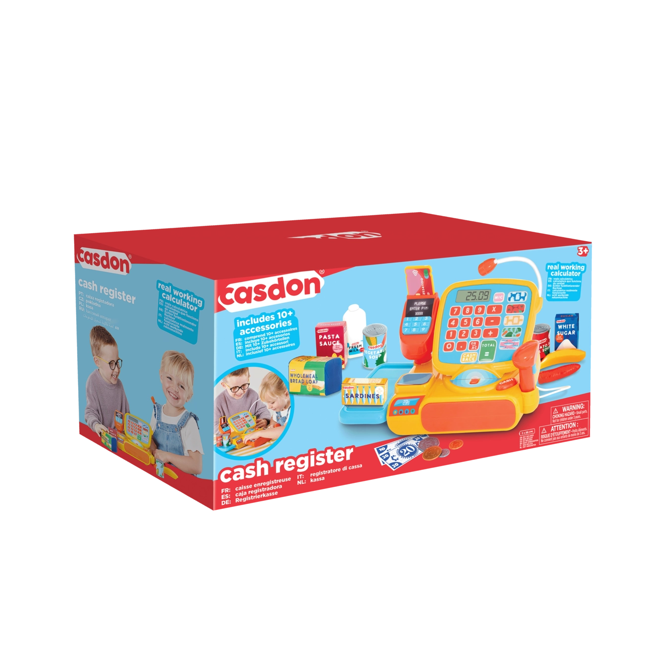 De kleurrijke kinderkassa van CASDON biedt realistisch winkelspeelplezier met rijk accessoires. Hij heeft een werkend display met rekenmachine, een barcodescanner, een kaartlezer, een weegschaal en een uitschuifbare geldlade. Inbegrepen zijn bankbiljetten, munten, betaalkaart en voedingsimitaties. Geluideffecten en een microfoon zorgen voor een nog realistischer ervaring.