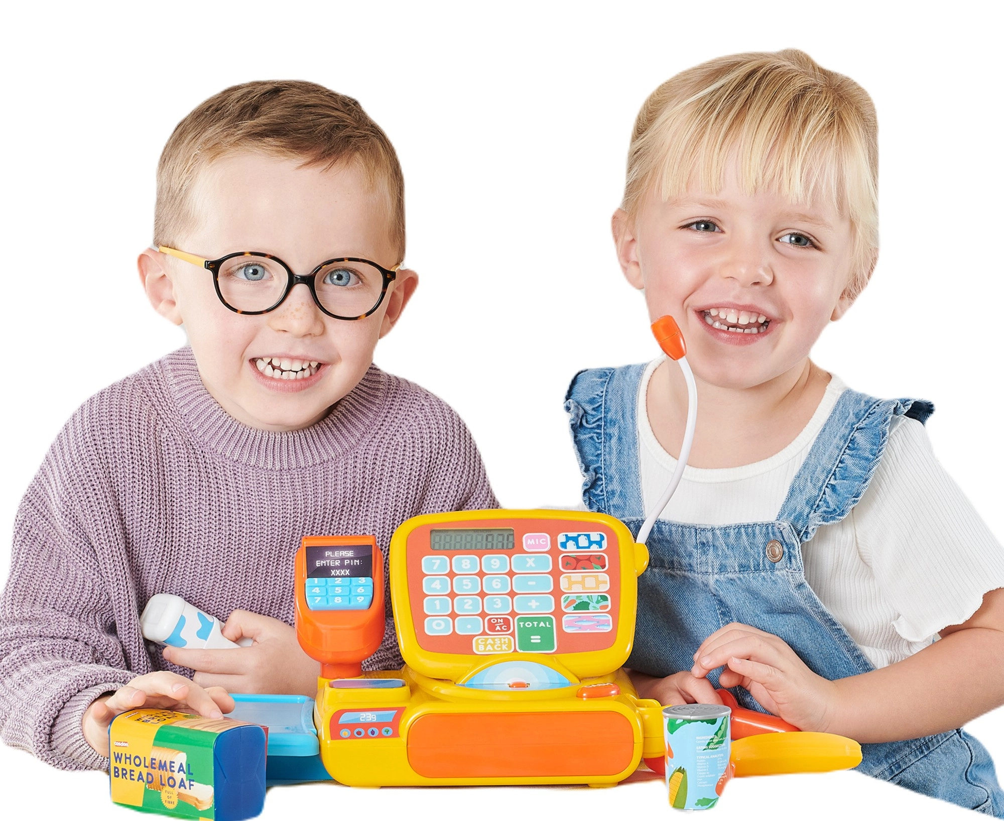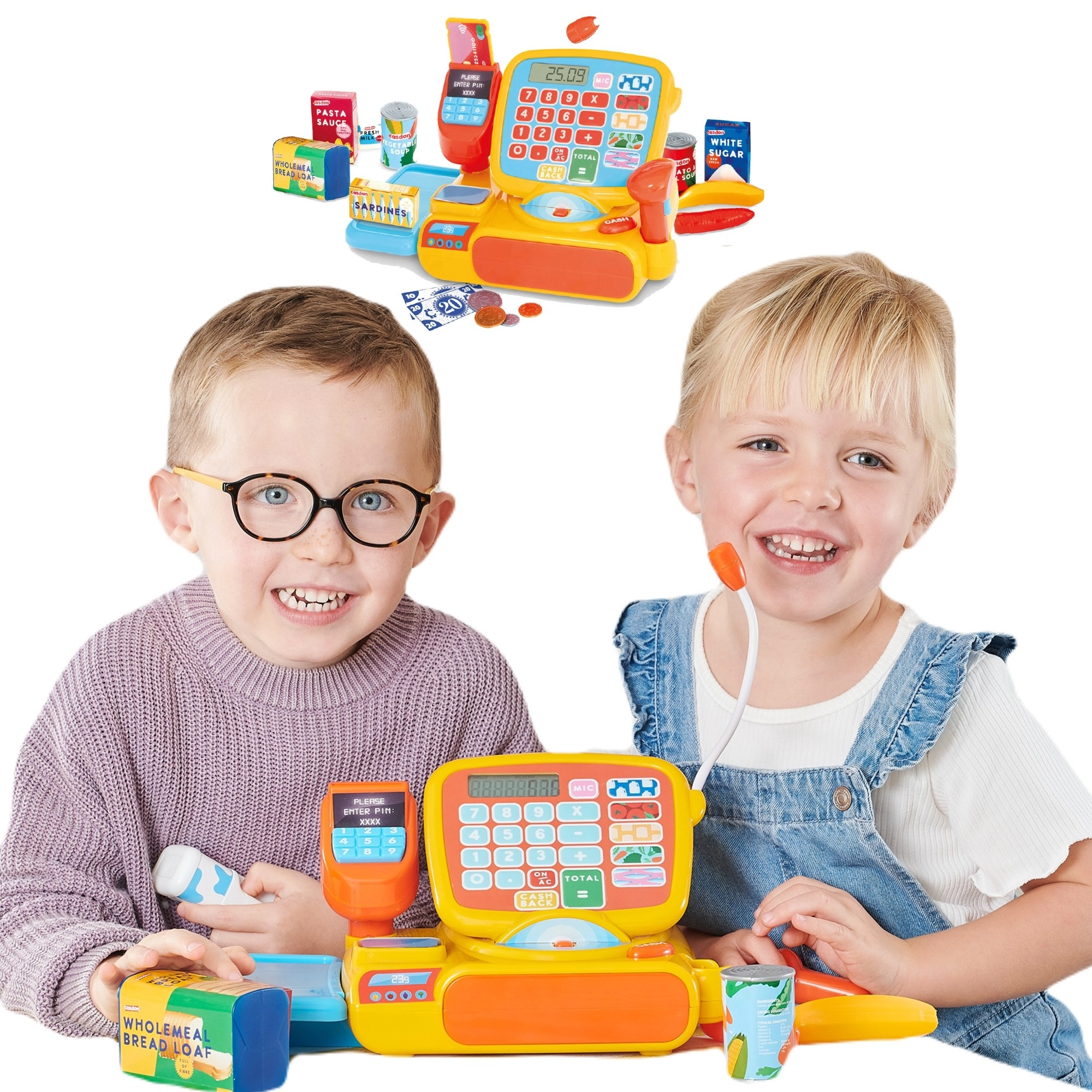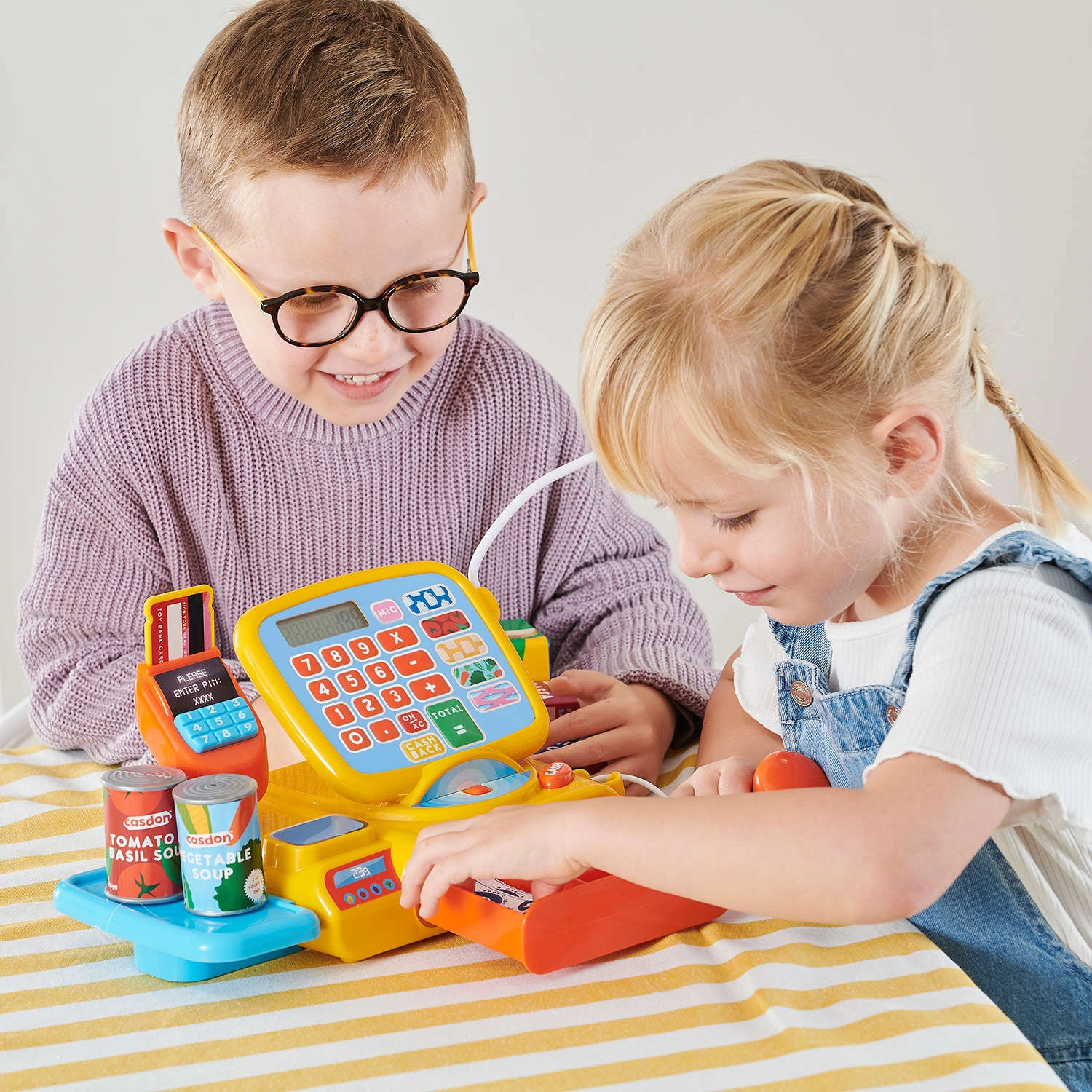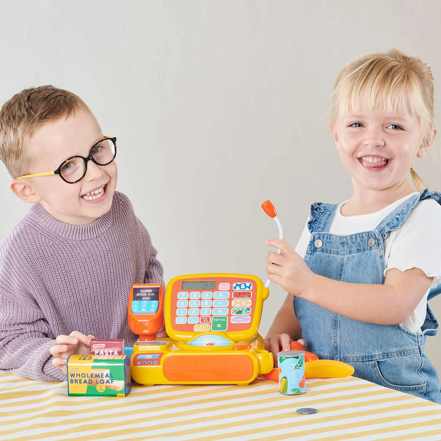 De kleurrijke kinderkassa van CASDON biedt realistisch winkelspeelplezier met rijk accessoires. Hij heeft een werkend display met rekenmachine, een barcodescanner, een kaartlezer, een weegschaal en een uitschuifbare geldlade. Inbegrepen zijn bankbiljetten, munten, betaalkaart en voedingsimitaties. Geluideffecten en een microfoon zorgen voor een nog realistischer ervaring.