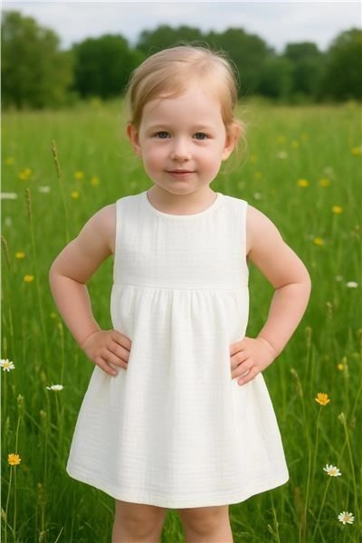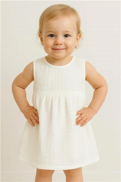Lichtgewicht mousseline jurkje New Baby Elizabeth voor kleine dametjes in maat 68. Mouwloos, A-lijn model, met drukknoopje achteraan voor makkelijk aankleden. Gemaakt van aangenaam, zacht en kwalitatief materiaal van 100% katoen – ademend, zacht voor de babyhuid en ideaal voor de zomer.