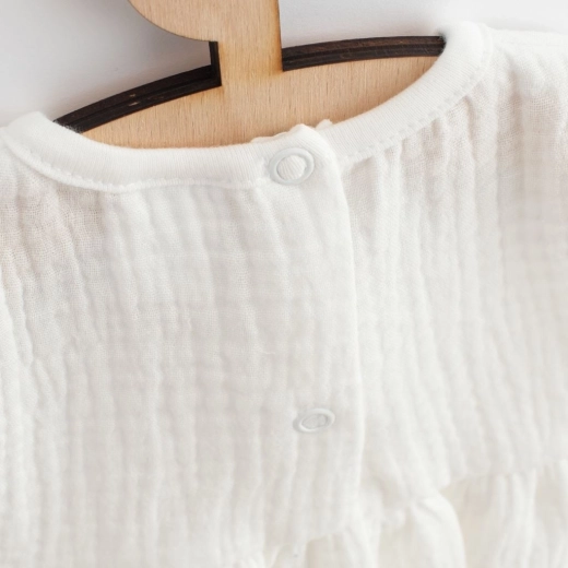 Mousseline wordt beschouwd als een van de zachtste en meest ademende stoffen. Het is zacht, licht en luchtig, helpt de temperatuur te reguleren en vermindert het risico op oververhitting. Bovendien is het duurzaam en wordt het nog zachter na elke wasbeurt. De praktische drukknoopsluiting op de rug vergemakkelijkt en versnelt het omkleden.