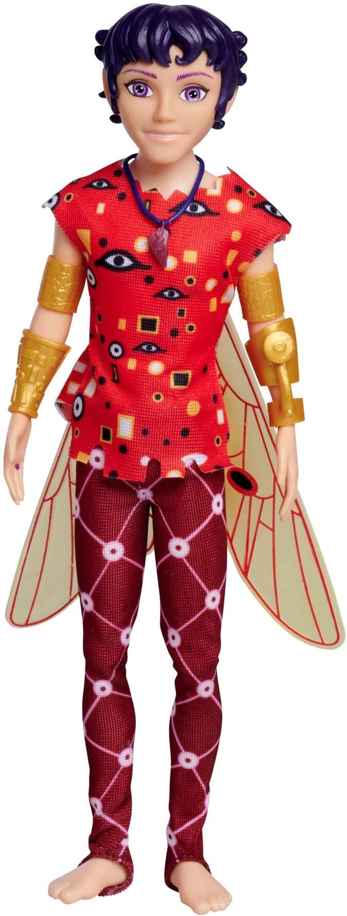 De uitrusting omvat ook stijlvolle accessoires, zoals een lange blauwe ketting met een rode steen en bijpassende armbanden. De figuur is een ideaal cadeau voor fans van de serie en stimuleert creatief en fantasierijk spel.
