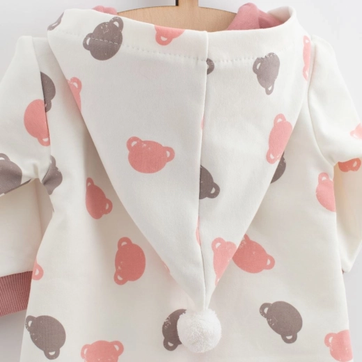 Schattige en praktische babyoverall met capuchon NEW BABY Little One in het roze, ideaal voor het hele jaar. Biedt een zachte joggingstof, een all-over berenprint, ritssluiting over de volledige lengte en elastische boorden voor perfect comfort.