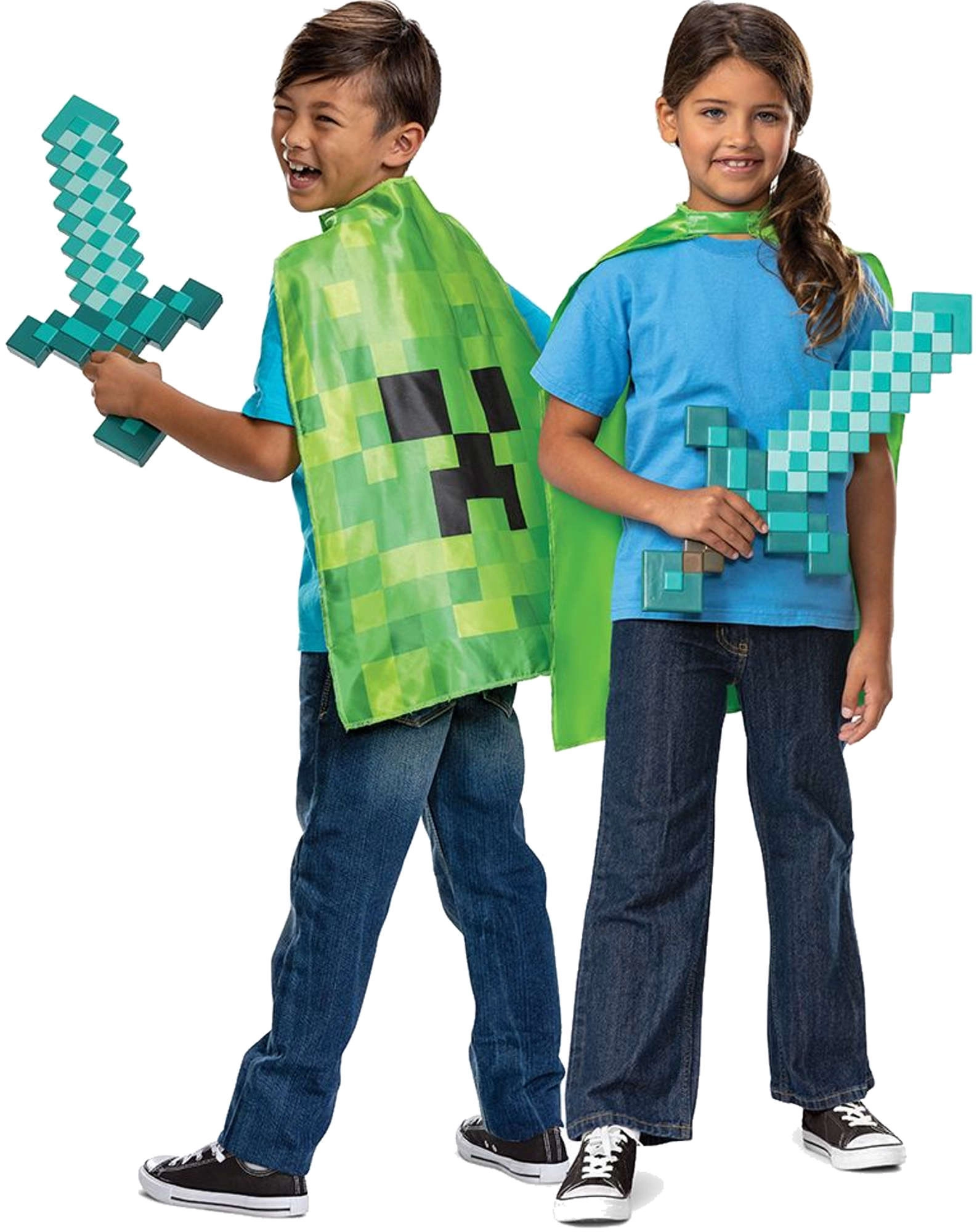 Stap de wereld van Minecraft binnen met de originele set van het merk Disguise: een kunststof diamanten zwaard met ergonomische greep en een cape met Creeper-gezicht. Kinderen zullen het authentieke “pixel” uiterlijk en het makkelijke draagcomfort van de cape meteen waarderen.