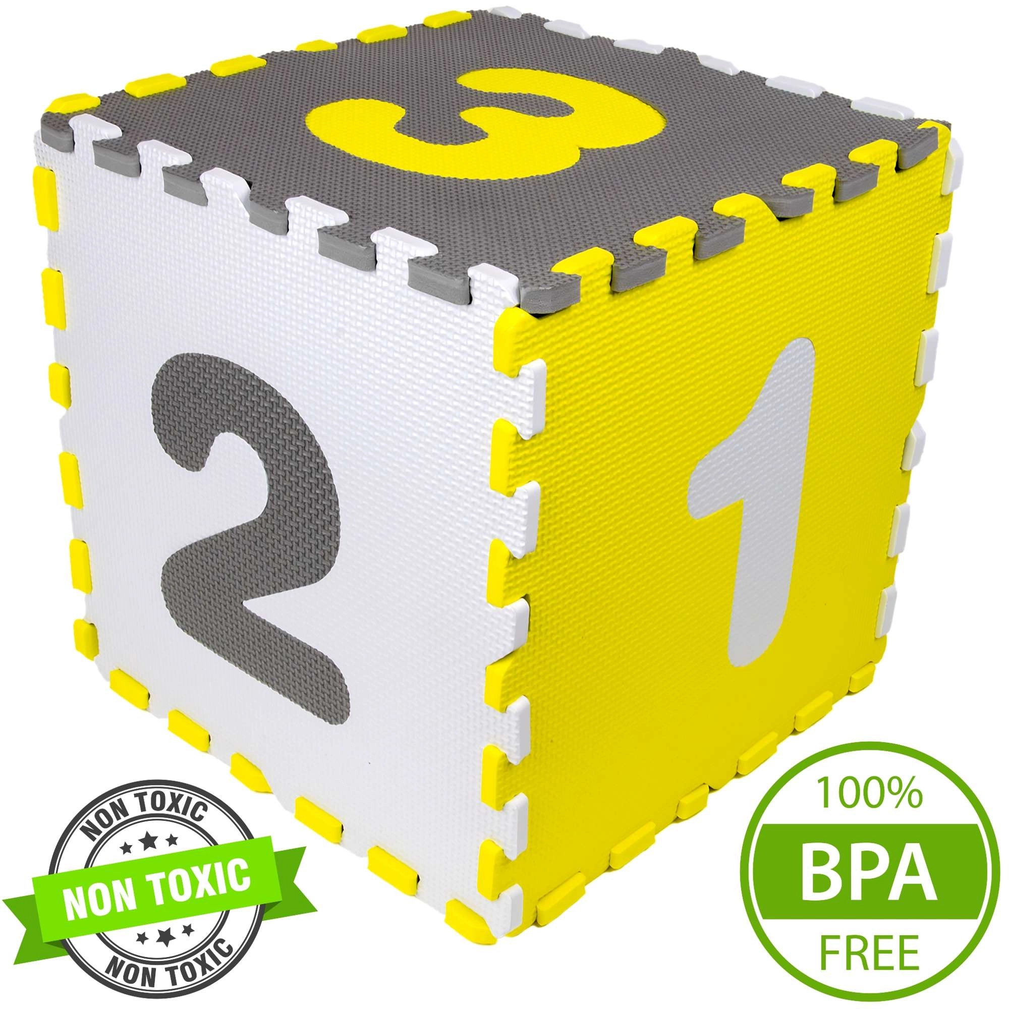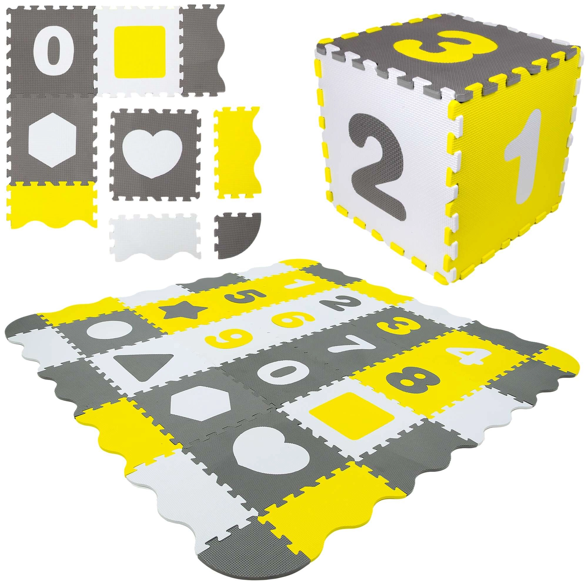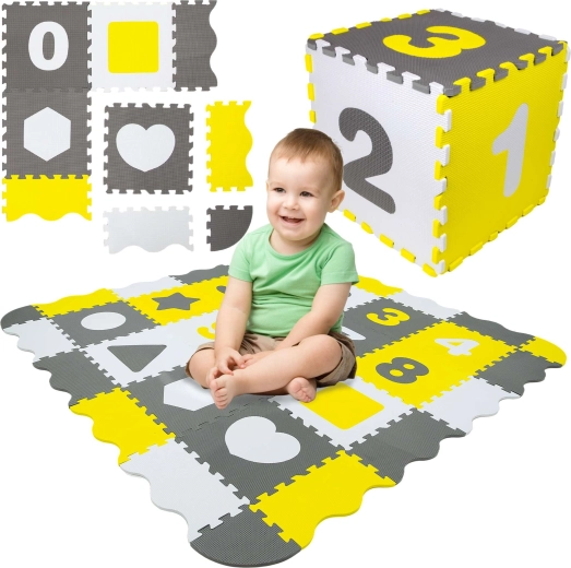 Praktische en veilige 3-in-1 mat voor baby’s en kinderen: zachte speelmat, XXL-box en 3D schuimpuzzel. Set van elastisch EVA-schuim met afmetingen 150 × 150 × 1 cm, antislip, waterdicht en makkelijk te reinigen. Bevat uitneembare onderdelen met cijfers 0–9 en geometrische vormen voor leren en motorische ontwikkeling. Vrij van ftalaten, formamide, BPA en PVC, voldoet aan EN 71 en REACH, met CE-markering.