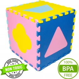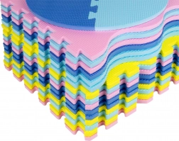 Het EVA-materiaal is waterbestendig en makkelijk te reinigen – afnemen met een vochtige doek is voldoende. De mat houdt geen stof of huisstofmijt vast en is daarmee ideaal voor een schoon en gezond kinderkamerklimaat. Neutrale maar contrasterende kleuren (licht- en donkerblauw, geel, roze) passen in het interieur en ondersteunen tegelijk de concentratie van je kind.