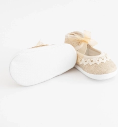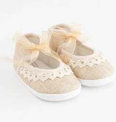Stijlvolle baby slofjes van New Baby in het bruin, ontworpen als schattige meisjessandalen met vetersluiting. Ze zijn lichtgewicht, hebben een brede binnenruimte voor vrije beweging van tenen en spieren, en een dunne synthetische zool. Het product is niet bedoeld om op te lopen. Geleverd in een praktische geschenkdoos.