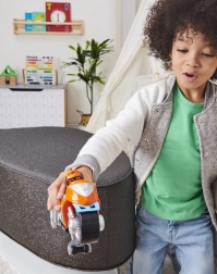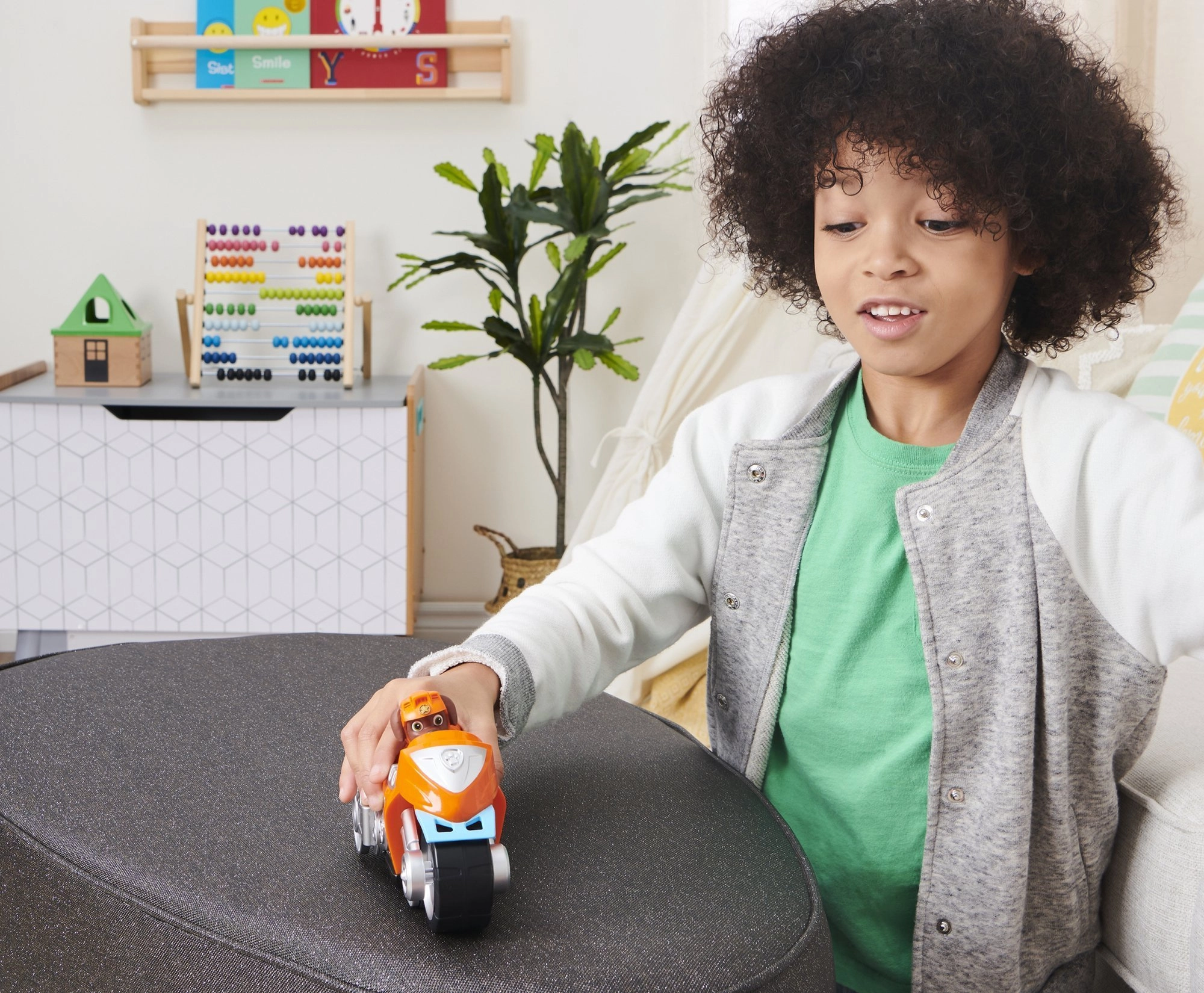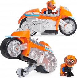 De populaire waterredder Zuma, de labrador uit het Paw Patrol-team, komt in de dynamische Moto Pups-editie met zijn oranje-zilveren motor. Na het opbouwen van vaart activeert zich het aandrijvingsmechanisme, dat het verborgen derde wiel onthult voor betere stabiliteit en plezierig rijden op een gladde ondergrond.