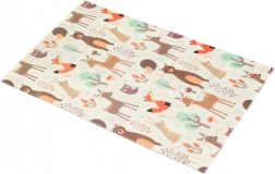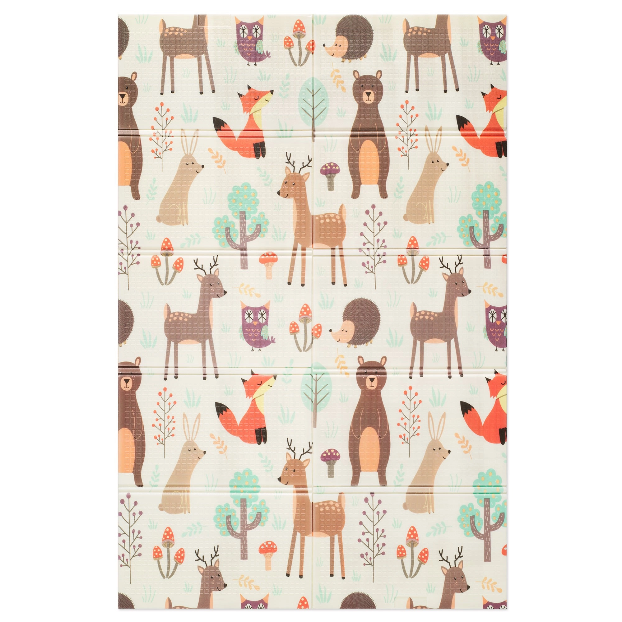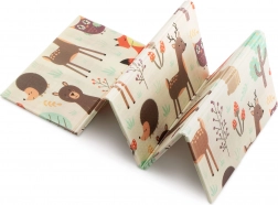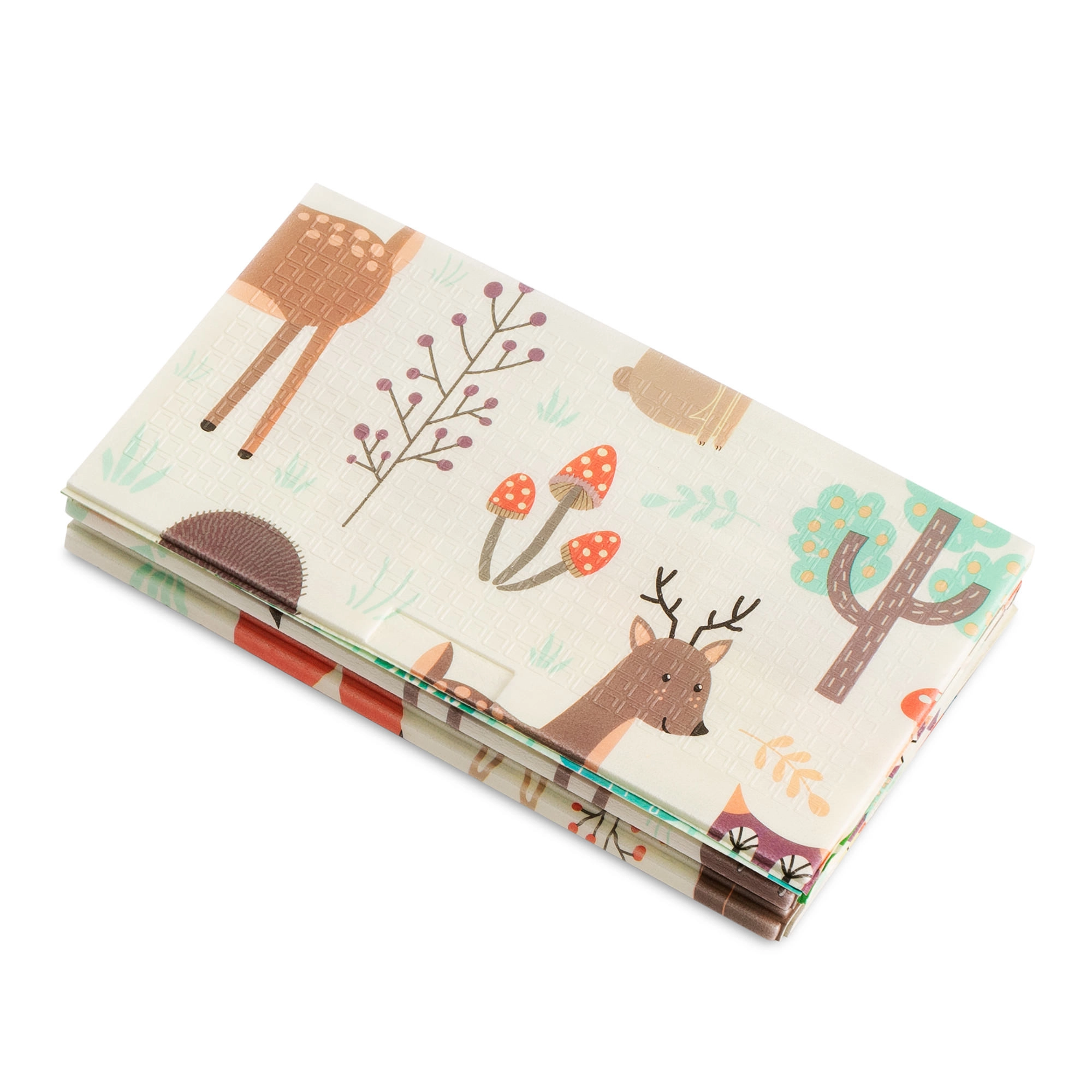 De mat is dubbelzijdig – aan de ene kant een schattig bosmotief, aan de andere kant wegen en gebouwen voor fantasierijk spel. Dankzij de vouwconstructie vouw je hem in enkele seconden uit of op en berg je hem op in de ritstas met handgrepen. Geschikt voor de kinderkamer, woonkamer en ook voor in de tuin of picknick.