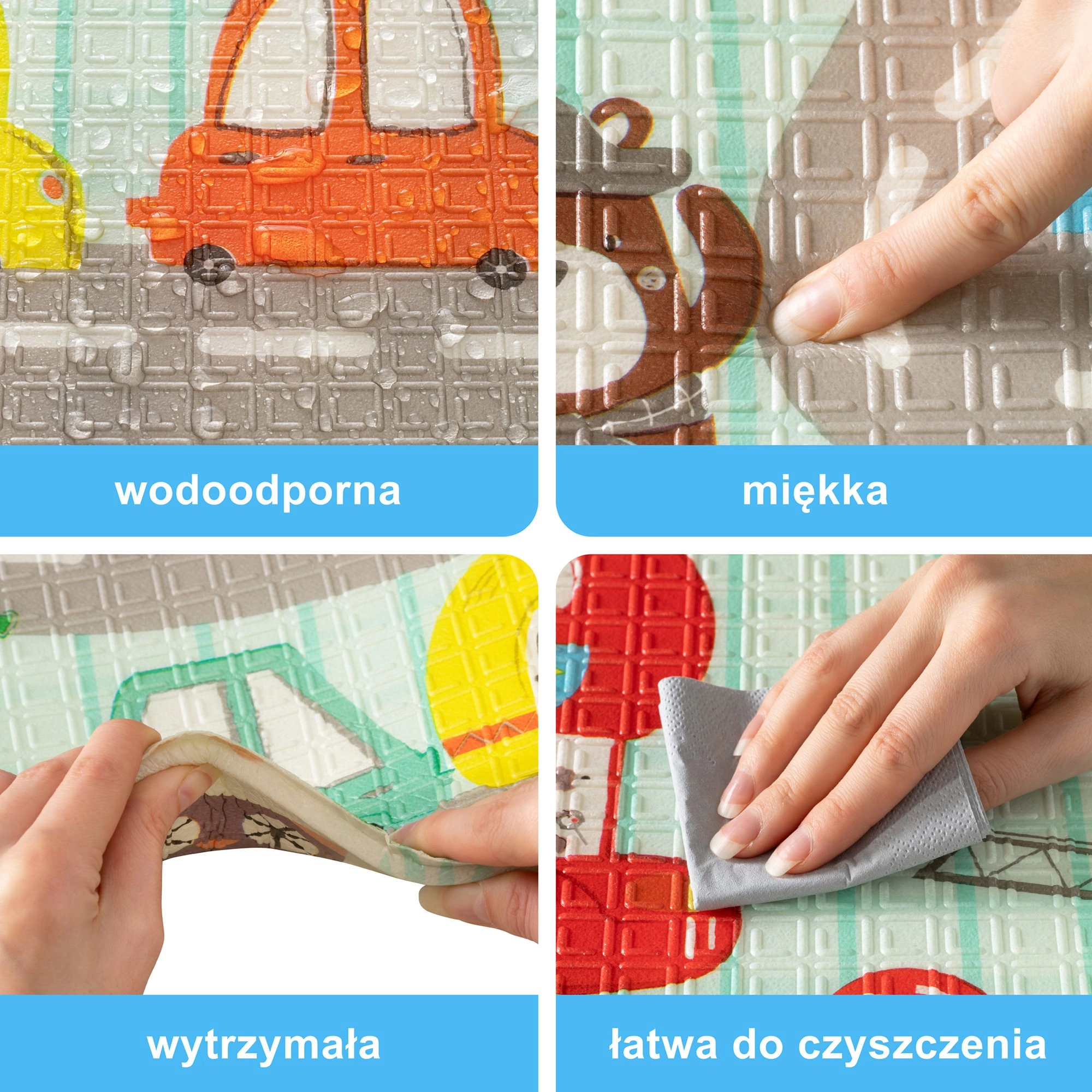 Praktische dubbelzijdige kinder speelmat HUMBI van hoogwaardige XPE-schuim met afmetingen 120 × 180 × 0,8 cm biedt een zachte, veilige en waterdichte ondergrond om te spelen, kruipen en de eerste stapjes. Hij is licht, snel opvouwbaar, makkelijk schoon te maken en wordt geleverd met een draagtas. De ene zijde toont bosdieren, de andere kleurrijke wegen en een stad voor extra fantasie.