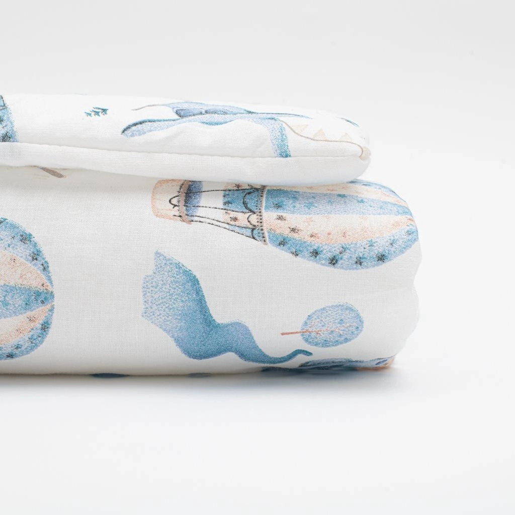De mooie katoenen set voor de kinderwagen New Baby Romance verrast met een subtiel design en comfort voor je baby. Bevat een kussentje en een dekentje met een print van een sprookjesachtig avontuur in de wolken. De vulling is anti‑allergisch, de hoes is van 100% katoen – zacht voor de babyhuid, warm en prettig aanvoelend.