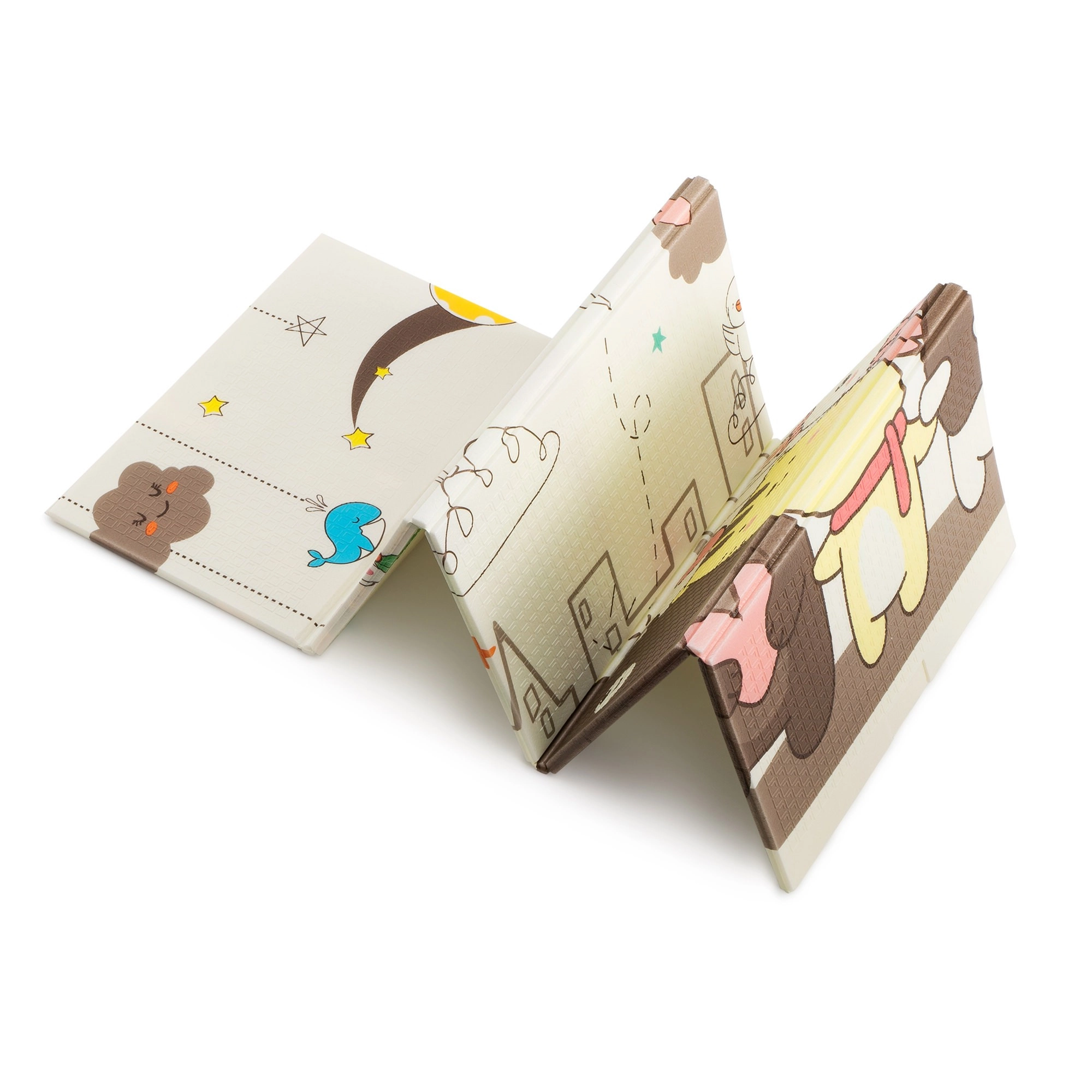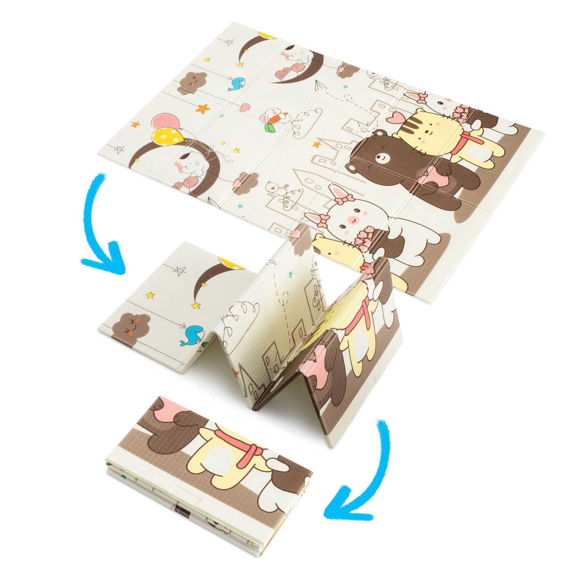Je vouwt de mat in enkele seconden op tot compacte panelen. Inclusief rits-tas met handgrepen, zodat je hem comfortabel meeneemt naar het park, een picknick of op reis.