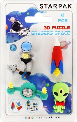 Leuke en creatieve gummen met een ruimtethema zullen elke kleine ontdekkingsreiziger blij maken. De afzonderlijke elementen kunnen van elkaar worden losgemaakt en naar wens worden gecombineerd als een 3D-puzzel, waardoor kinderen hun fijne motoriek, fantasie en creativiteit ontwikkelen. De verpakking bevat 4 gummen en is geschikt voor kinderen vanaf 3 jaar.