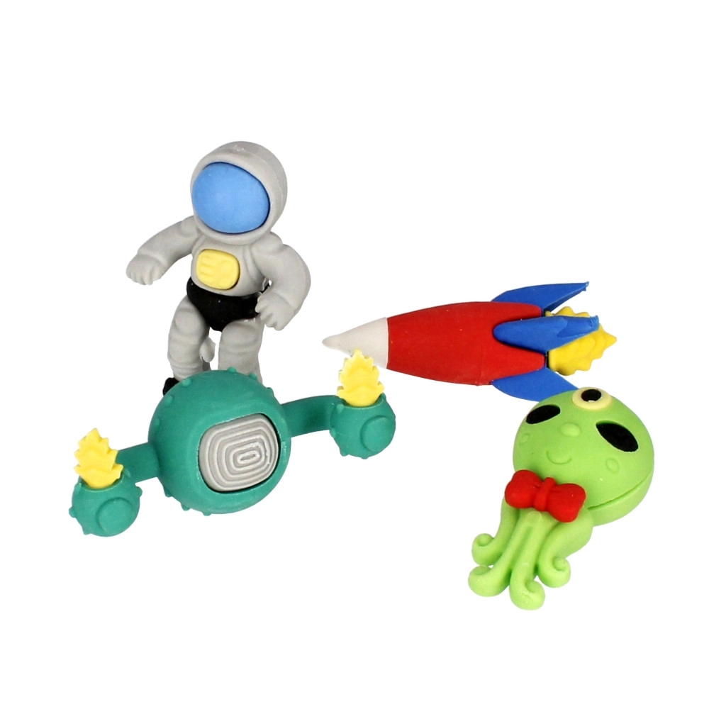 Ontdek een fantasieruimte met een originele set gummen die je kunt samenstellen als een 3D-puzzel. Elke gum bestaat uit meerdere onderdelen die eenvoudig uit elkaar te halen en weer in elkaar te zetten zijn – zo kunnen kinderen hun eigen combinaties maken en nieuwe vormen ontdekken.