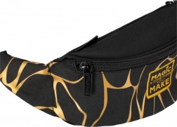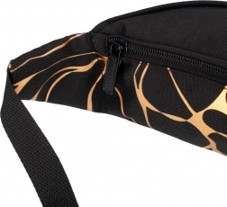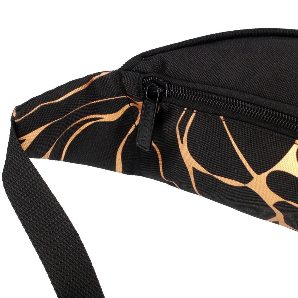 Het slijtvaste materiaal is gemakkelijk schoon te maken; de zwarte basis met goudkleurig patroon en badge geeft de heuptas een opvallende look.