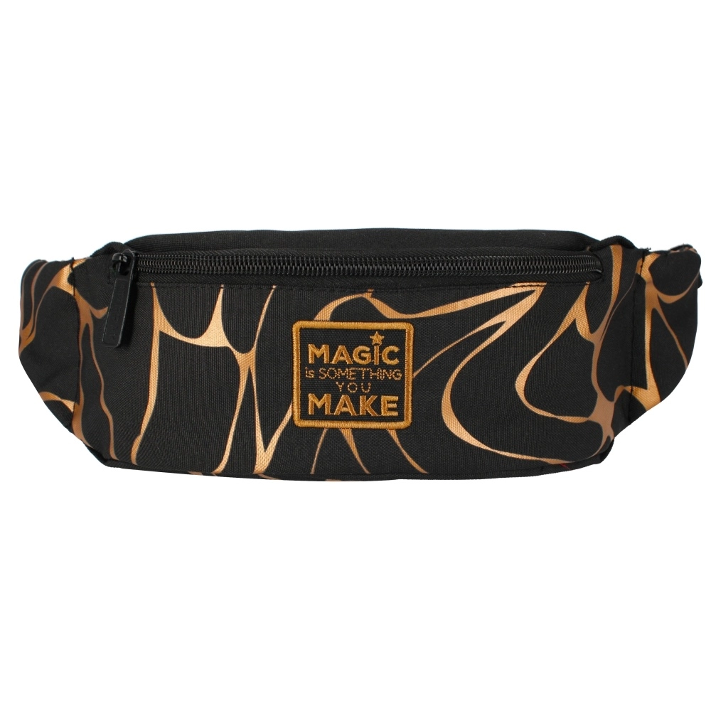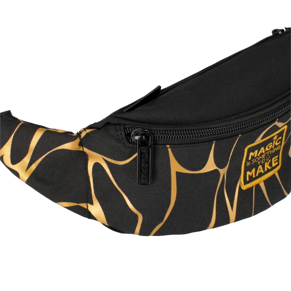 Ervaar gemak en vrije handen met de STARPAK Golden-heuptas. Het elegante zwarte design met opvallende print en textiele patch “Magic is something you make” gaat hand in hand met functionaliteit: twee ritsvakken houden je essentials overzichtelijk en veilig, terwijl de verstelbare riem dragen rond de taille of schuin over de borst mogelijk maakt.