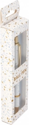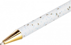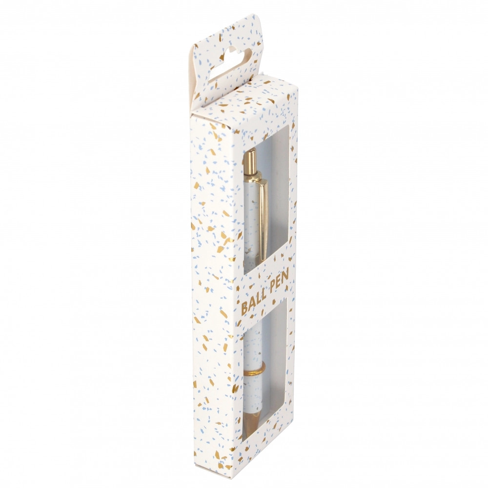 Het moderne terrazzodesign in wit met gouden en blauwe accenten wordt aangevuld met elegante metalen details, representatief op je bureau of als klein geschenk. De lengte van de pen is ongeveer 14 cm, ligt prettig in de hand en past in gangbare etuis.