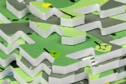 Delen kunnen worden verbonden tot grotere oppervlakken of gebruikt om kubussen en andere 3D-vormen te bouwen. Randstrips zorgen voor een nette afwerking van de speelzone.