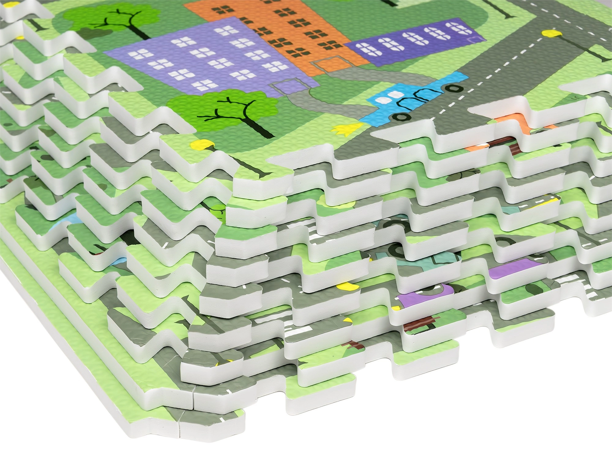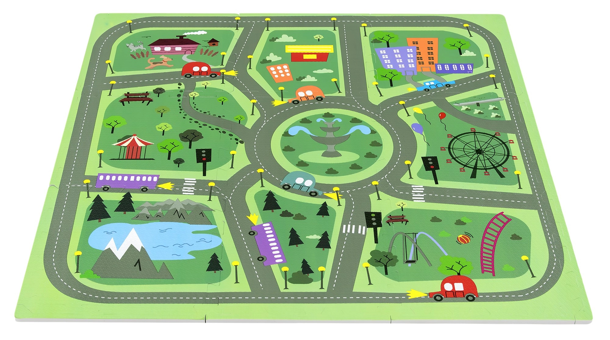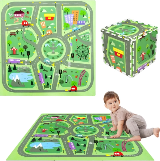 Creëer voor je kind een comfortabel en hygiënisch speelplekje. De mat van veerkrachtig EVA-schuim is vrij van ftalaten, formamide, PVC en BPA, heeft een antislip oppervlak en subtiele reliëfs voor zekerdere eerste stapjes. Het zachte stadsstratenmotief met rotonde, parken, vijver en gebouwen prikkelt de fantasie en nodigt uit tot ritjes met autootjes en creatief spel met figuurtjes.