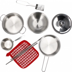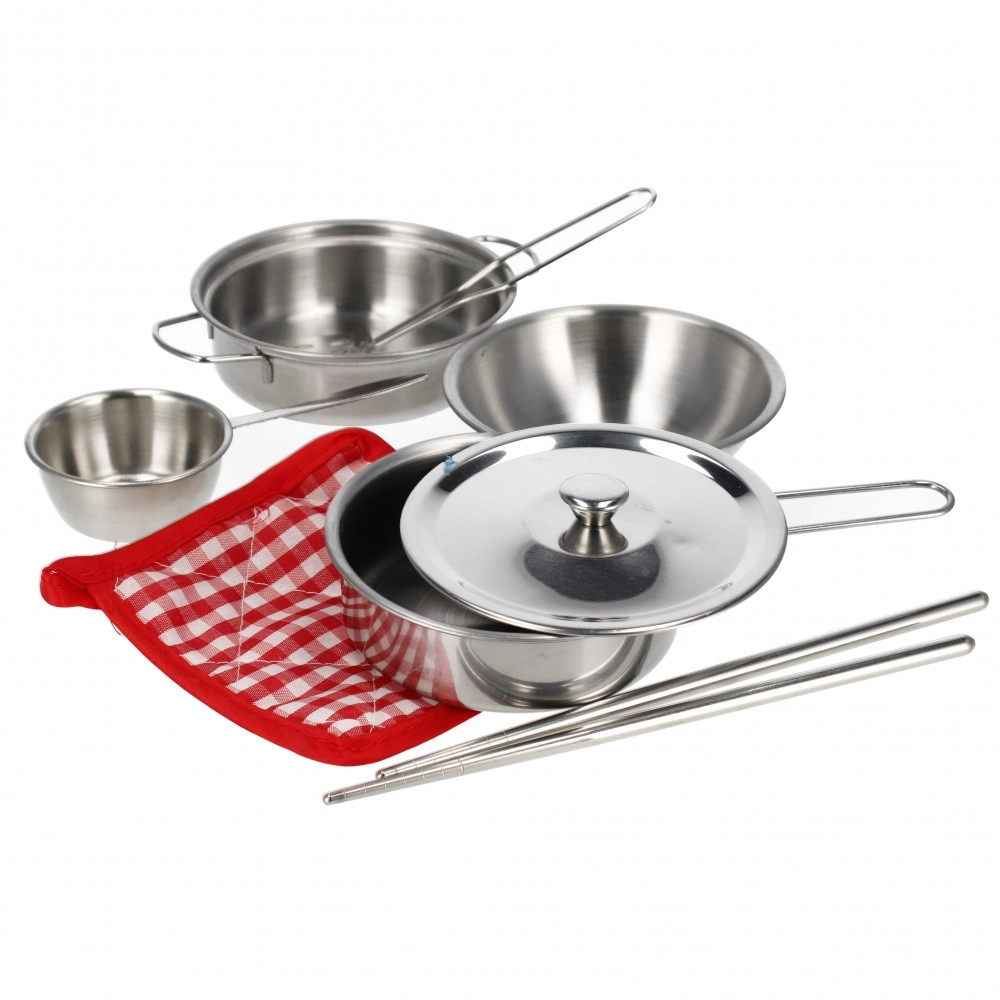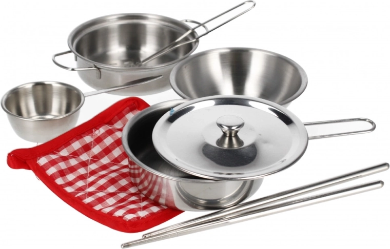 Leuke kinderkeukenset voor kleine koks vanaf 3 jaar. Bevat een pan met deksel, een kom, een opscheplepel, een doek en stokjes om koken na te spelen. Ideaal voor de ontwikkeling van fantasie, fijne motoriek en rollenspel in het kinderkeukentje.