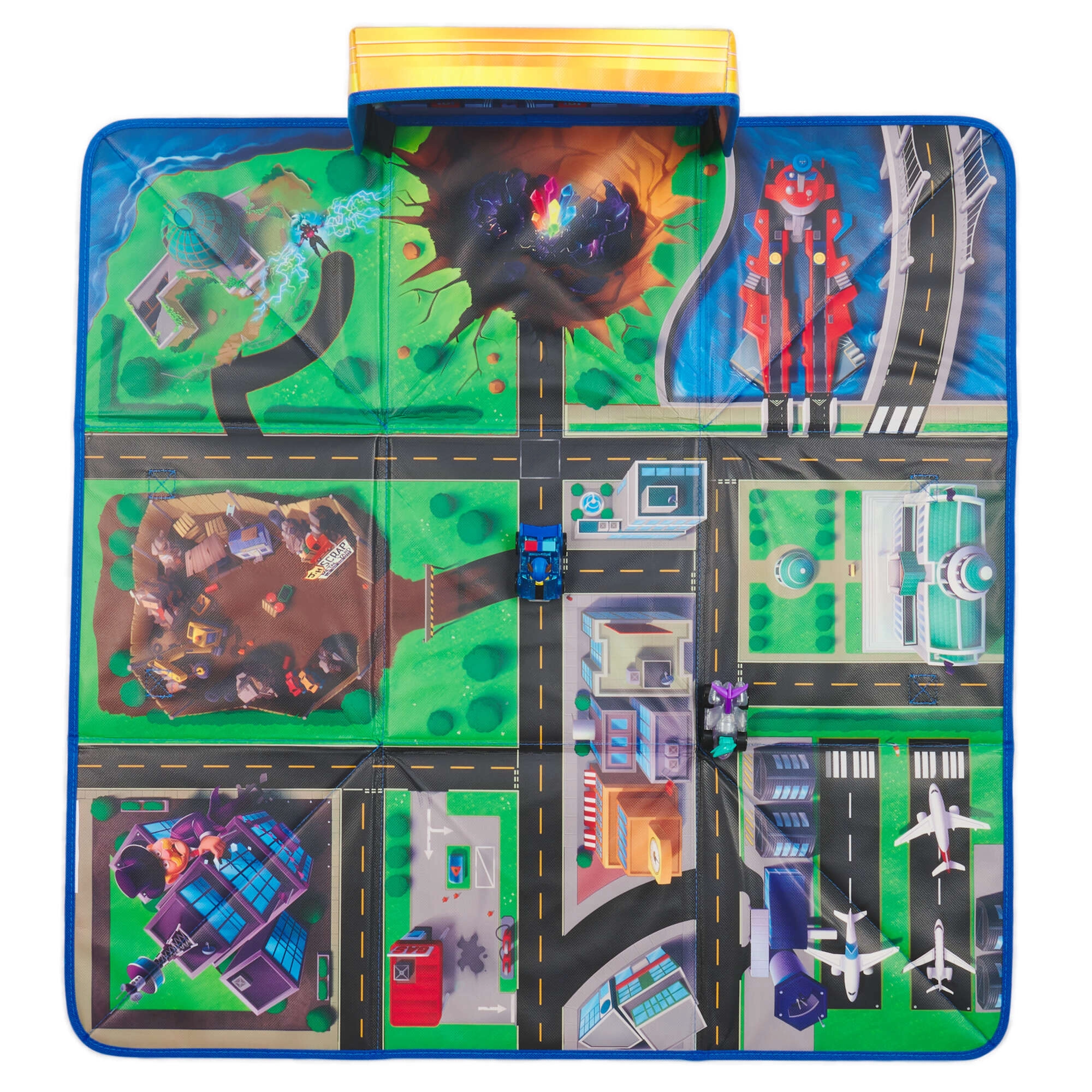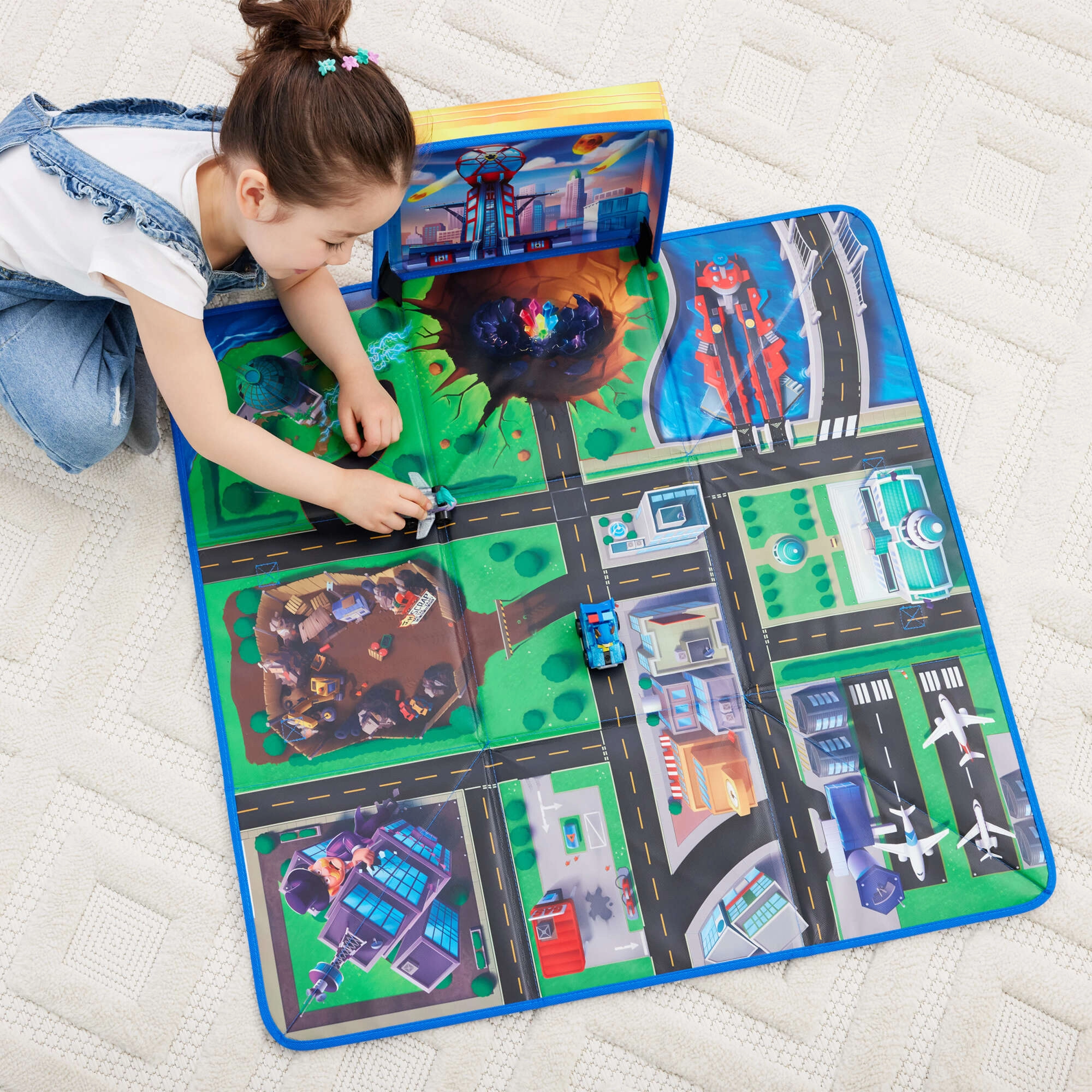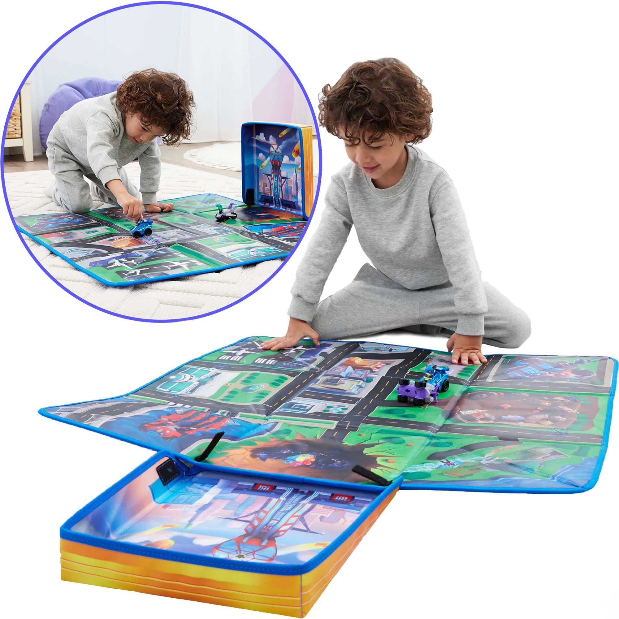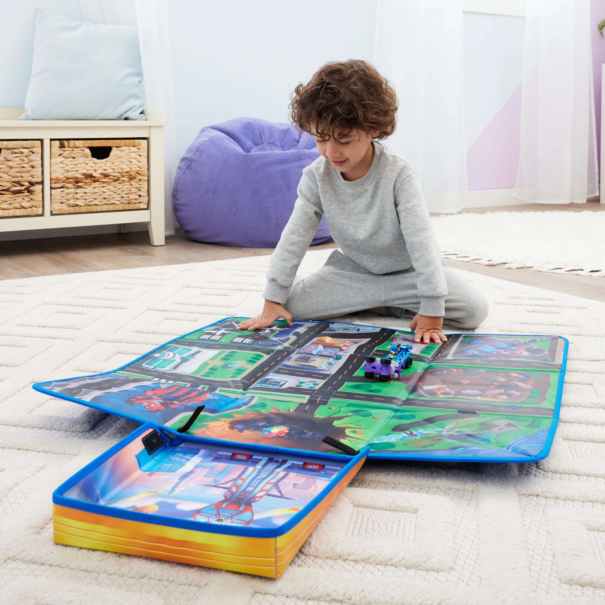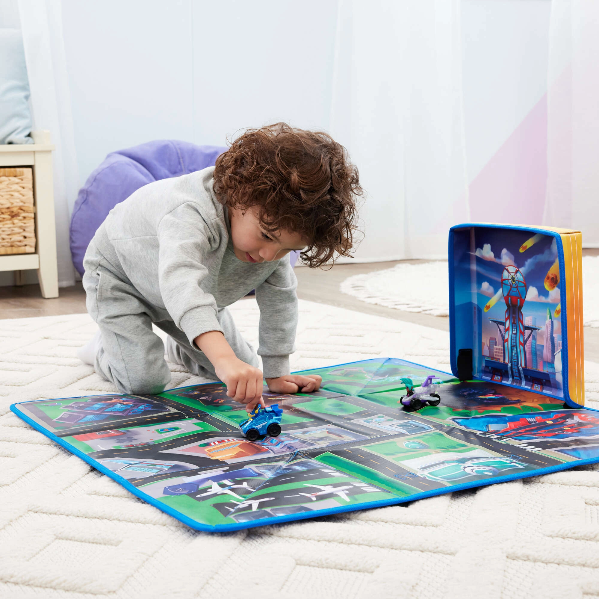Na het spelen verandert de mat in een oogwenk in een stabiele opbergdoos van 25,4 × 25,4 × 25,4 cm, waar autootjes en figuren in passen. In de verpakking vind je ook een Chase Rescue Racer en een exclusieve Vee Rescue Racer, zodat je meteen na het uitpakken kunt gaan rijden.