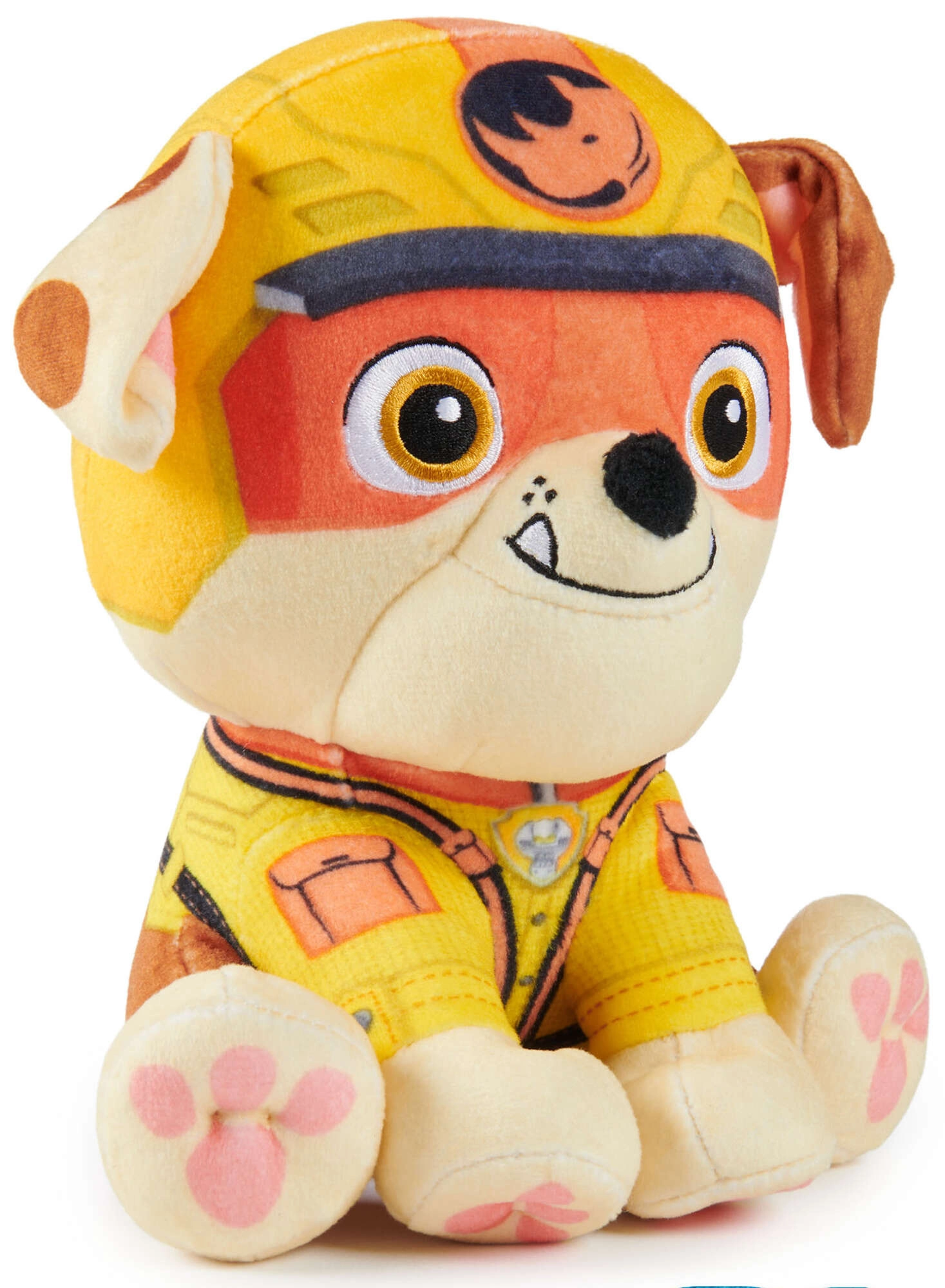 De gele helm, het uniform en de zittende houding geven het personage Rubble uit de Jungle Pups-serie getrouw weer.