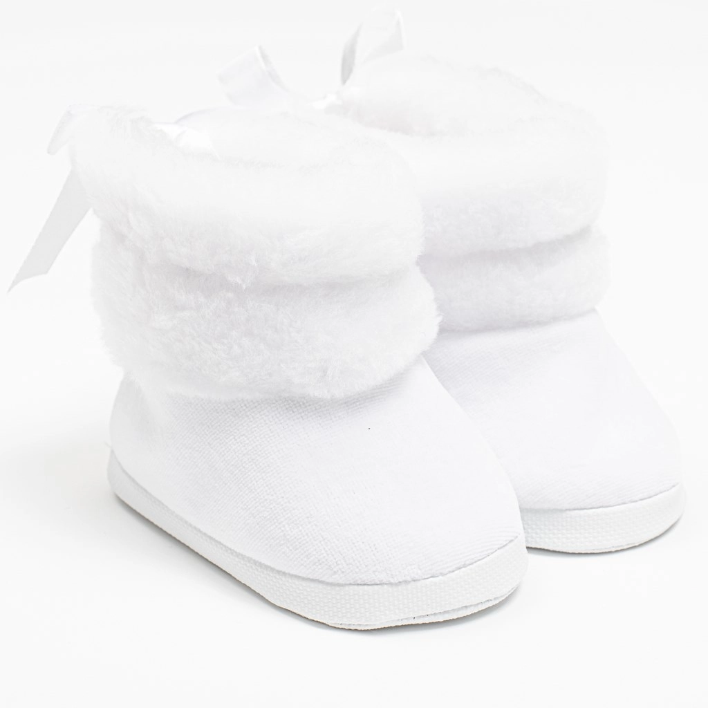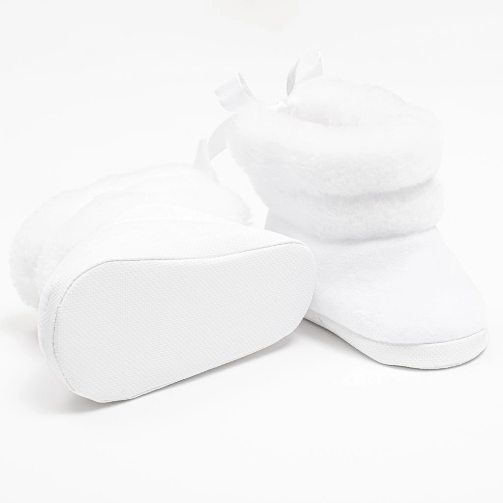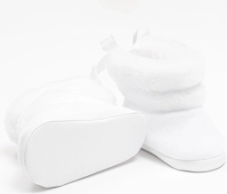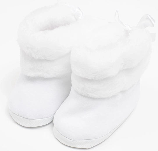 Schattige en praktische New Baby winterlaarsjes voor baby’s in het wit voor kindjes van 0–3 maanden. Ze zijn heerlijk zacht en warm, gemaakt van suède met een zachte wellsoft voering voor maximaal comfort. Dankzij de vetersluiting blijven ze goed aan het voetje zitten, hebben ze een ruime binnenkant voor vrije teenbeweging en een licht, dun zooltje. Ideaal voor in de winter in de kinderwagen – niet bedoeld om mee te lopen.