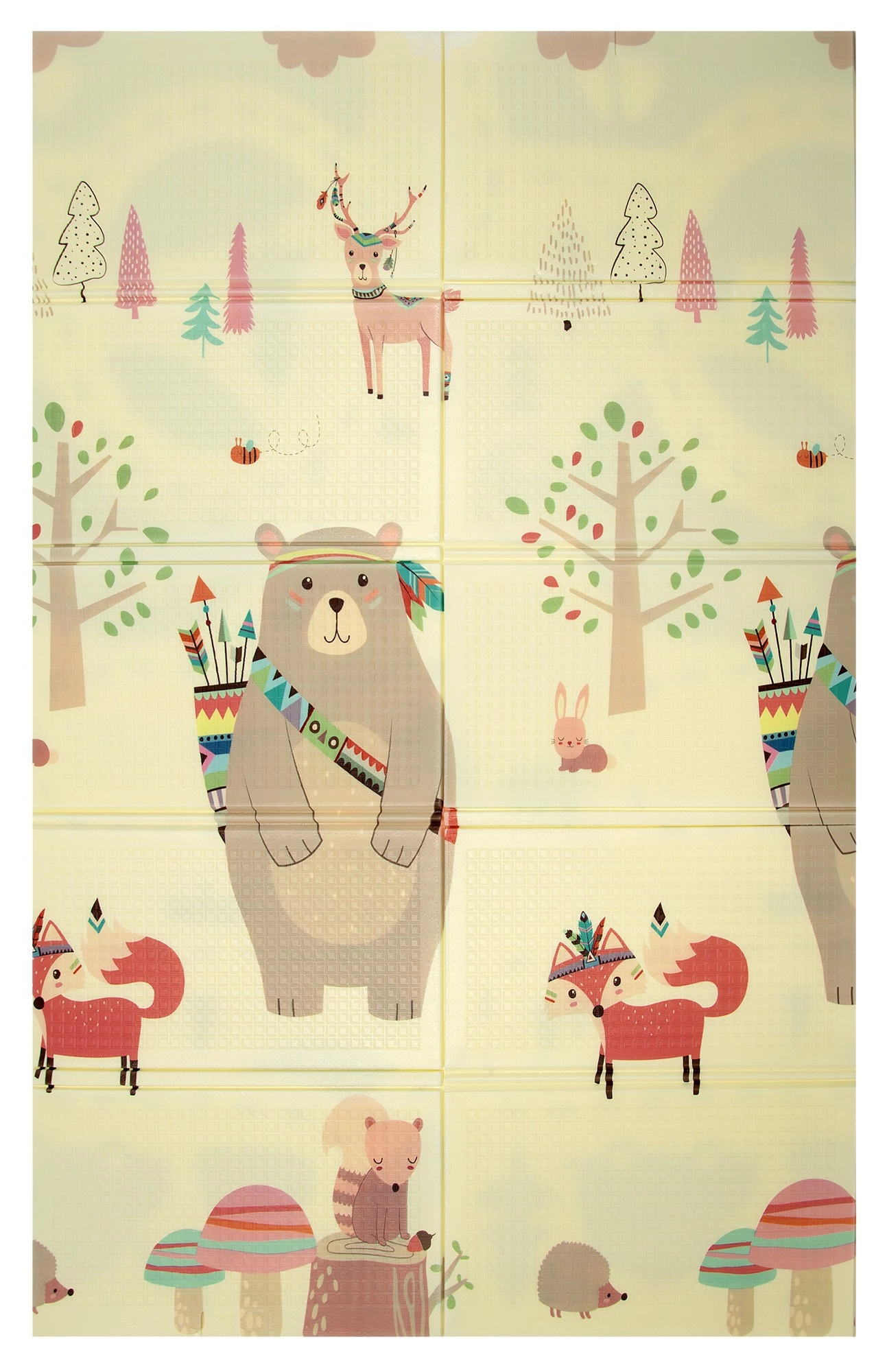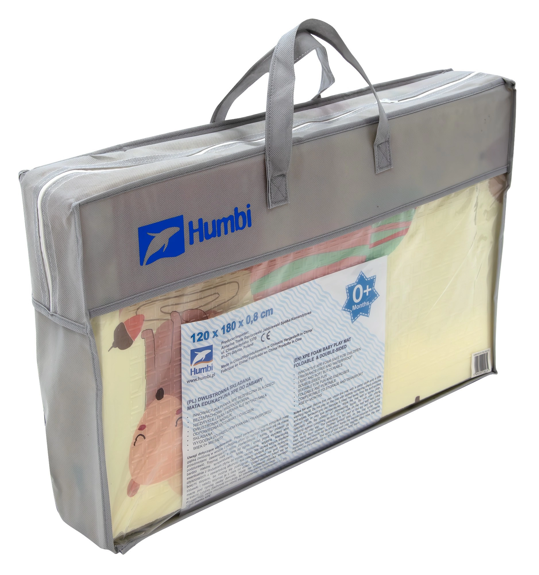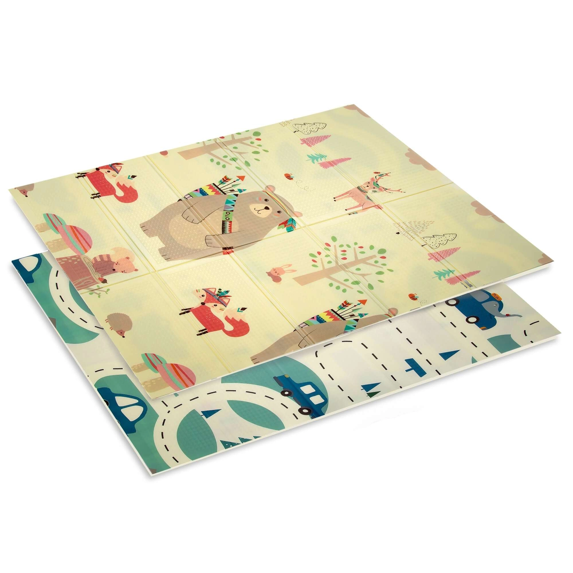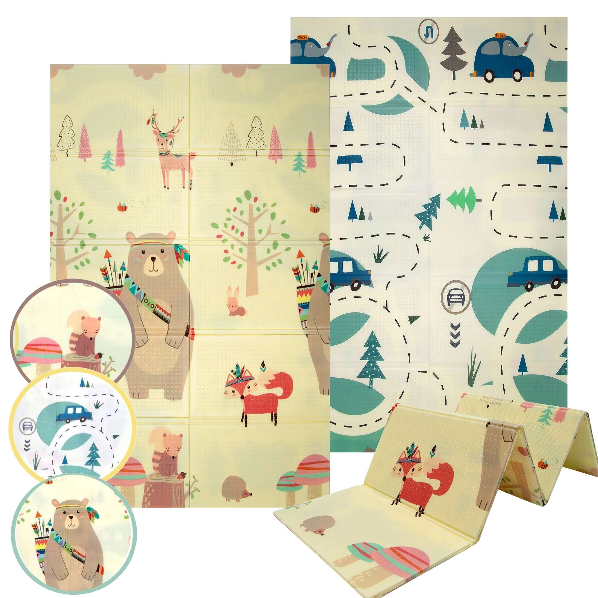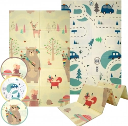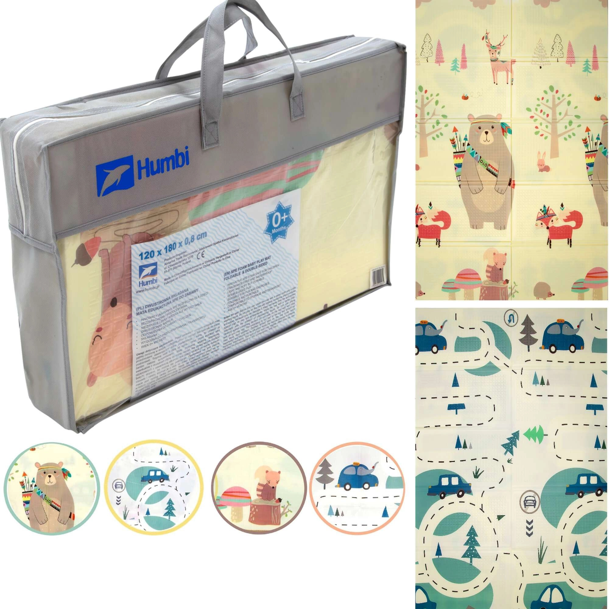 De HUMBI-mat biedt kinderen een zachte en veilige plek om te spelen, te rusten en de motoriek te ontwikkelen. Het hoogwaardige XPE-schuim is stevig, absorbeert schokken en isoleert uitstekend tegen kou vanaf de vloer. Het dubbelzijdige ontwerp toont aan de ene kant lieve bosmotieven (beren, vossen, egels) en aan de andere kant een weg met autootjes voor leuk rijden met speelgoedauto’s en sensorische ontdekking.