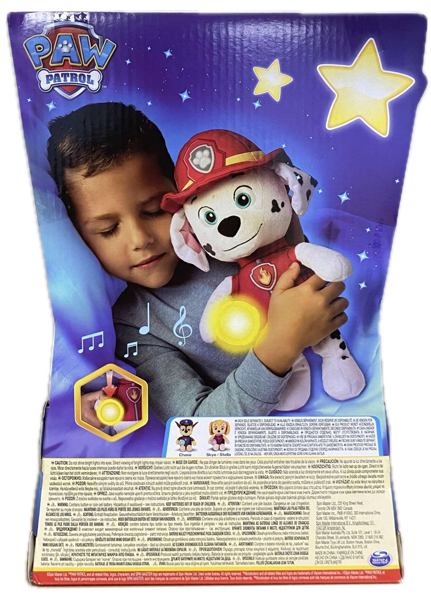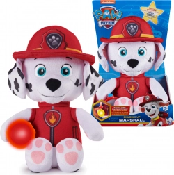 Verras kinderen met een superzachte vriend uit de geliefde serie PAW PATROL! De pluche Marshall is 32 cm hoog, draagt zijn kenmerkende rode brandweeroutfit en houdt in zijn poot een lichtgevende zaklamp die na het indrukken het licht aanzet, rustige melodieën afspeelt en welterusten in het Engels wenst. Ideaal om mee te knuffelen, om mee te spelen en als kalmerend nachtlampje.