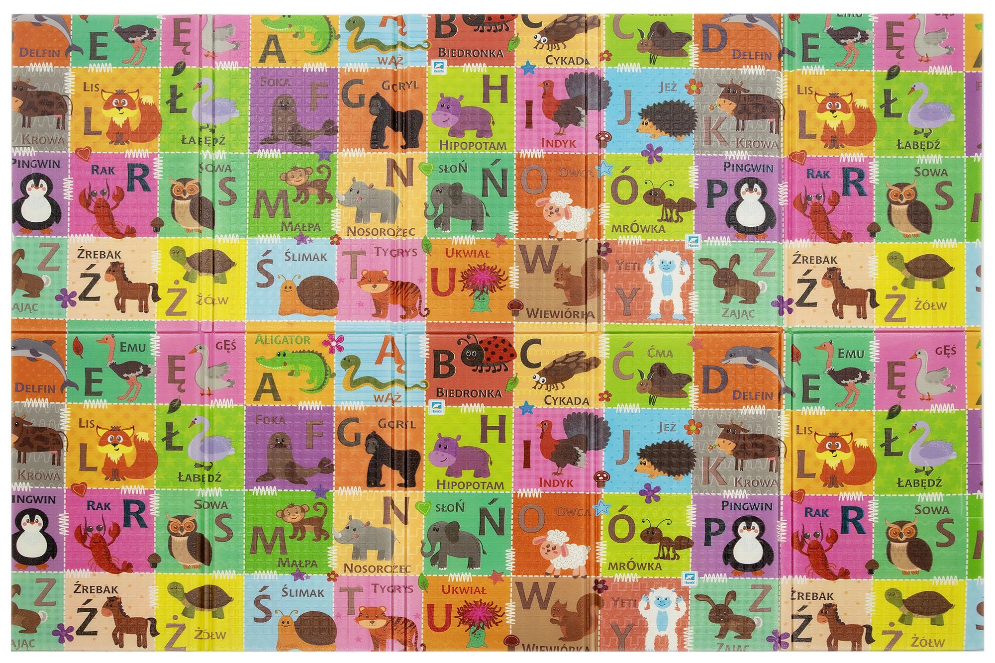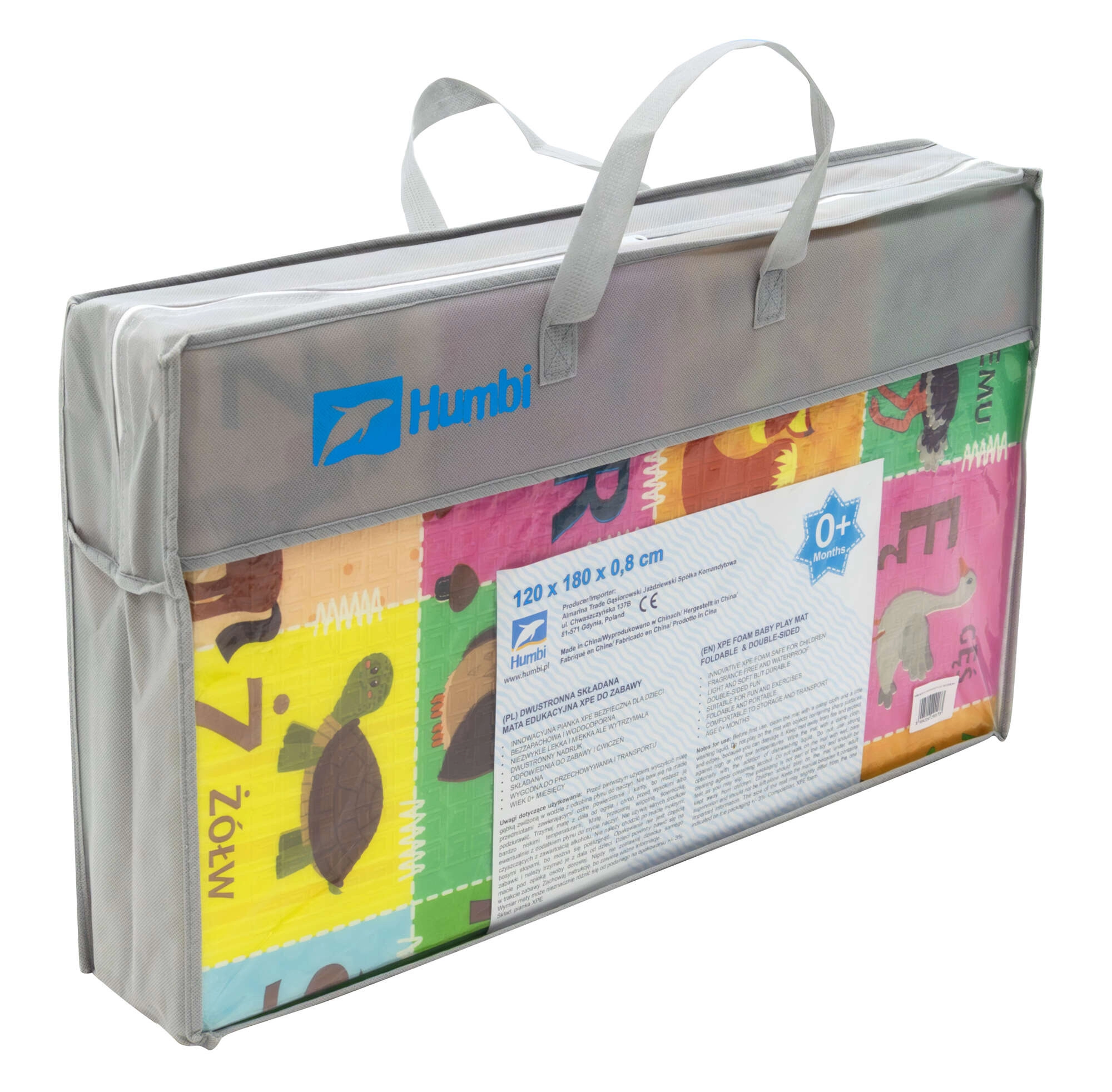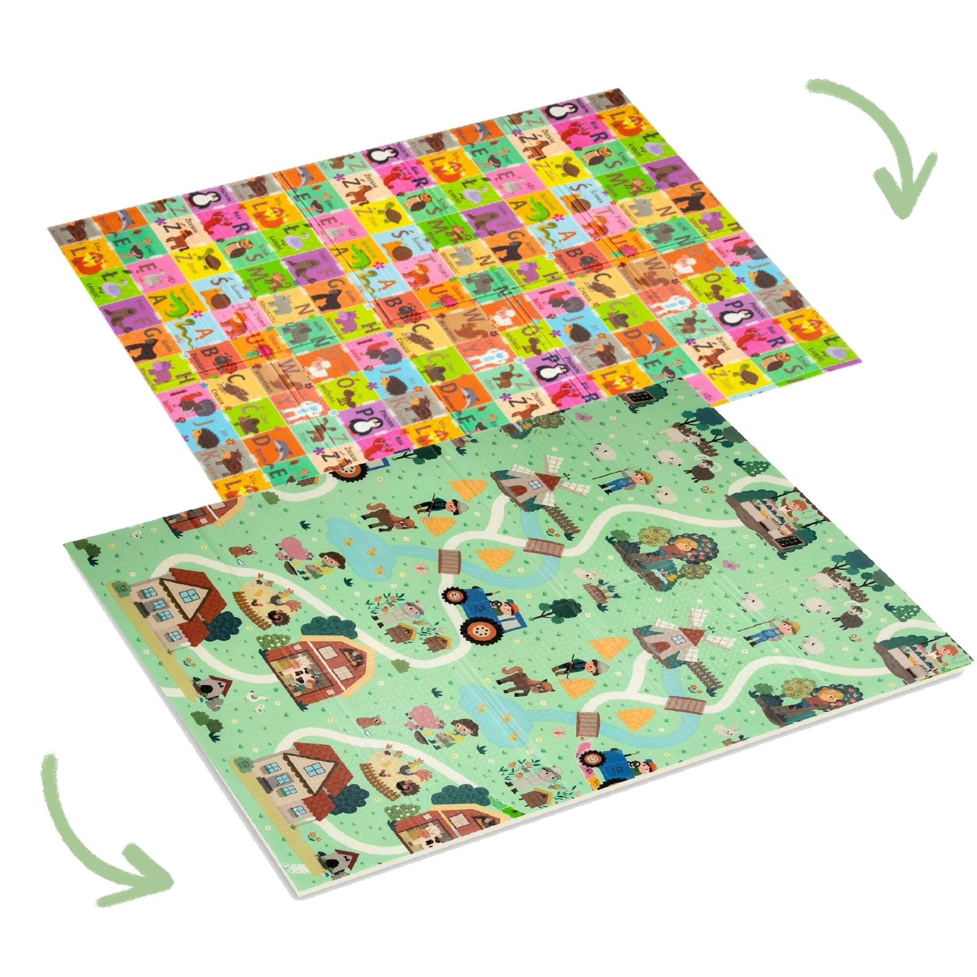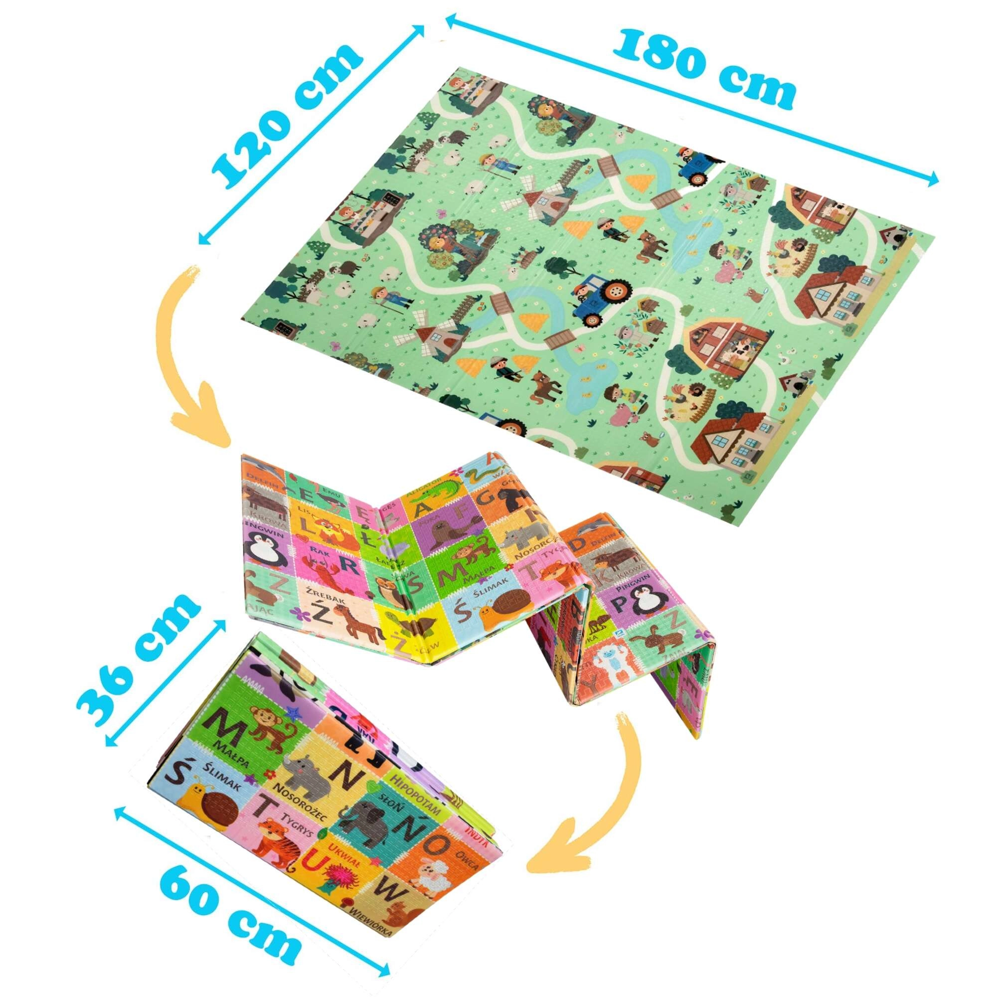 Het dubbelzijdige design stimuleert leren en creativiteit: één zijde met een kleurrijk alfabet en dieren bevordert het herkennen van letters, de andere zijde met een dorp, huisjes en wegen nodigt uit tot fantasierijk spel. De mat is antislip, waterdicht en hygiënisch – afnemen met een vochtige doek is voldoende. Dankzij de opvouwbare constructie vouw je hem snel op, berg je hem eenvoudig op en draag je hem comfortabel met de meegeleverde tas met handvat.