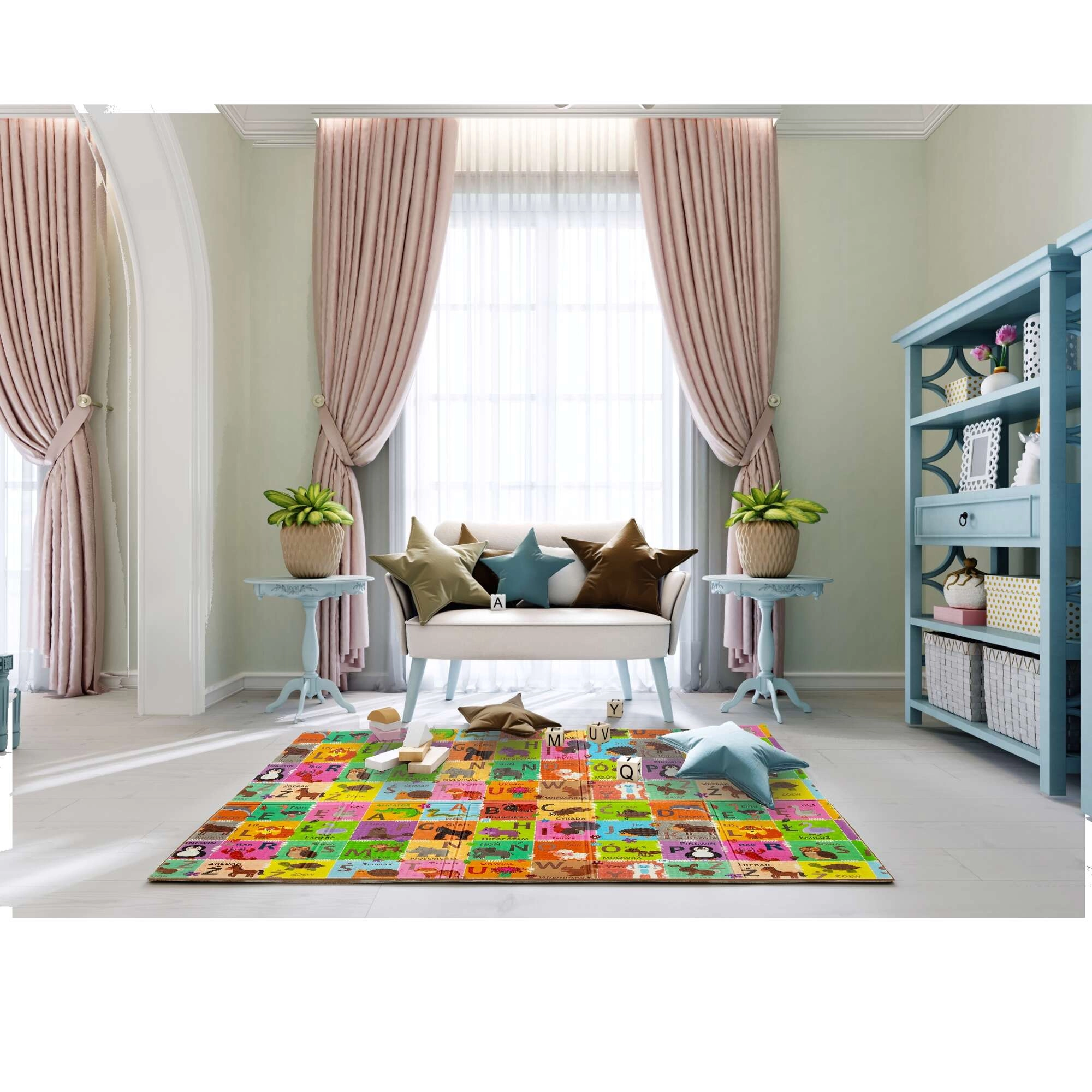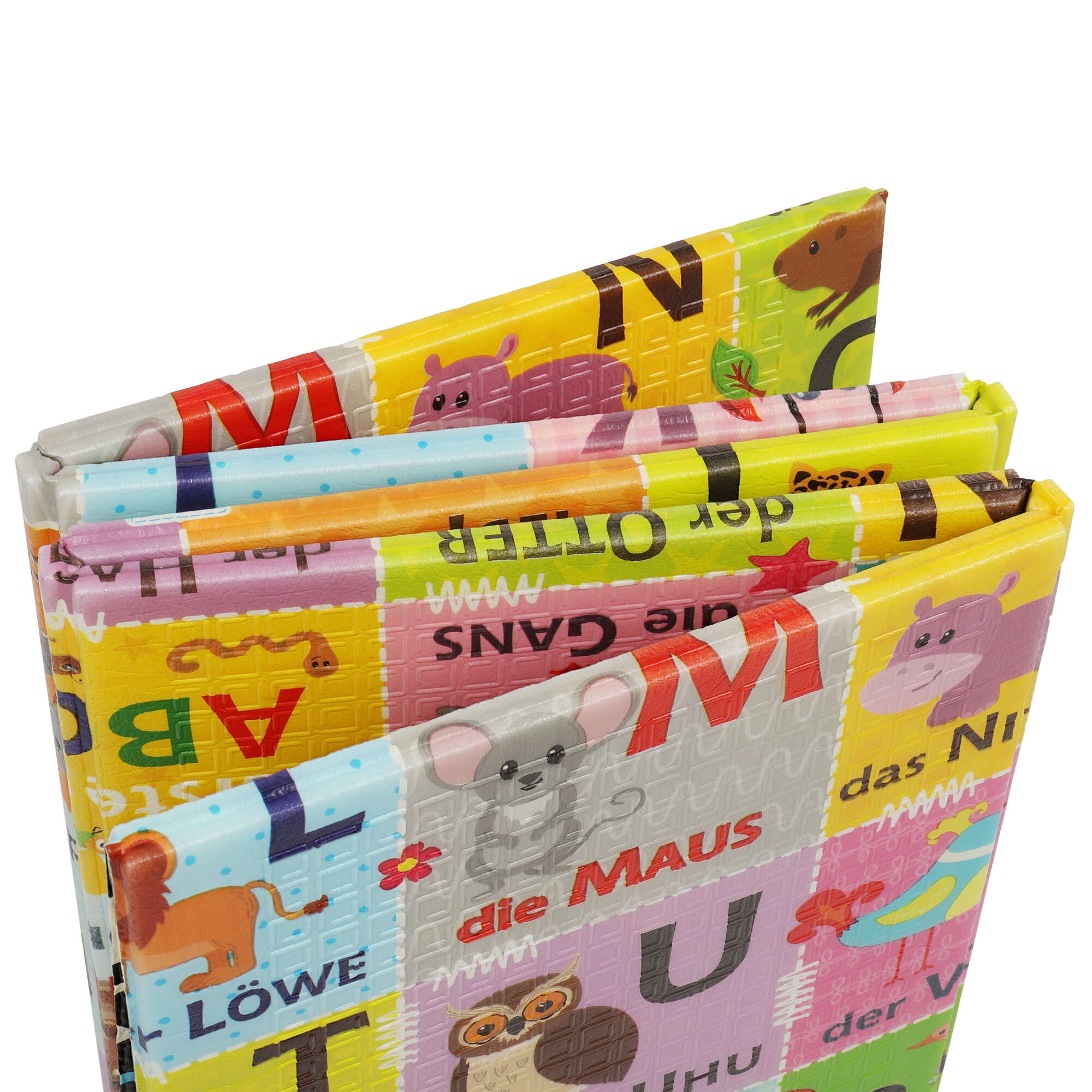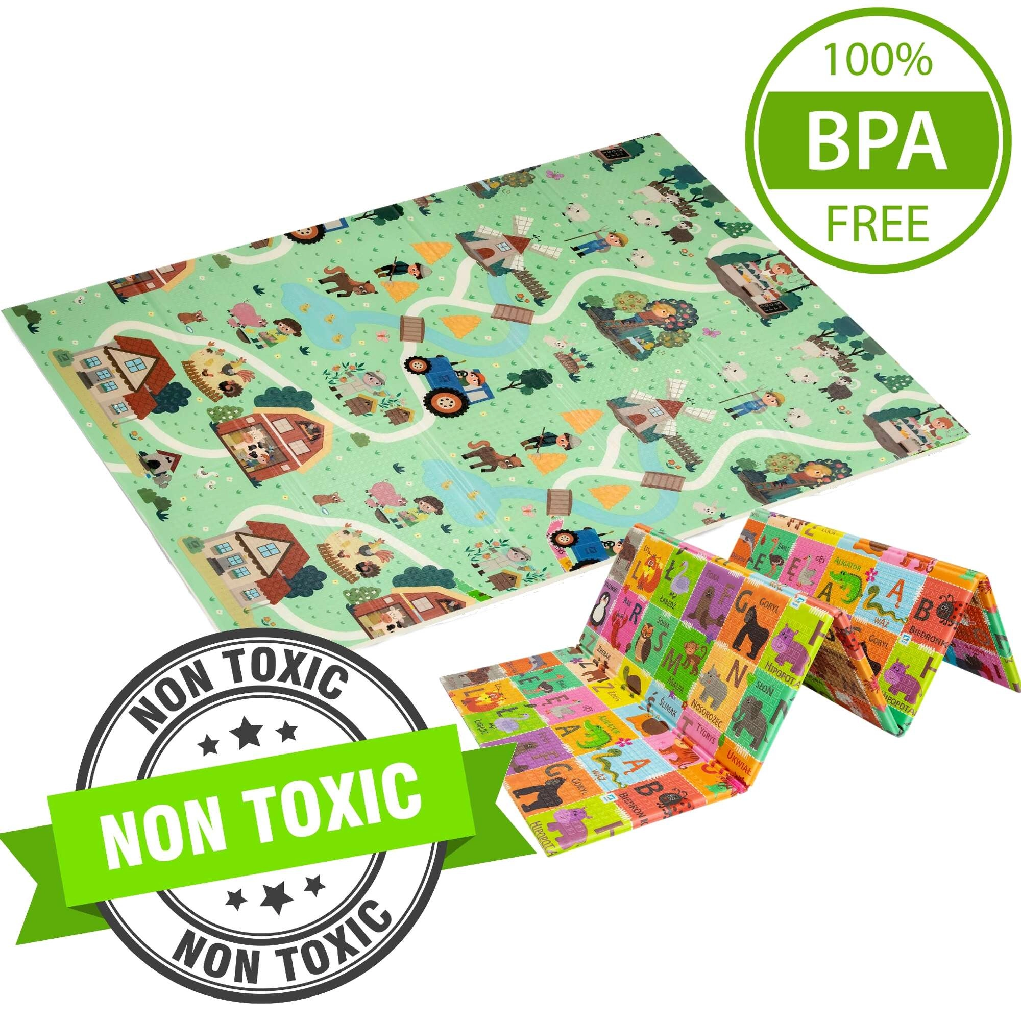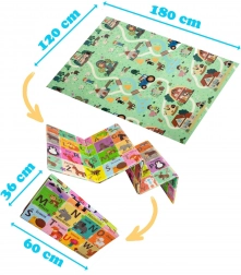 Het dubbelzijdige design stimuleert leren en creativiteit: één zijde met een kleurrijk alfabet en dieren bevordert het herkennen van letters, de andere zijde met een dorp, huisjes en wegen nodigt uit tot fantasierijk spel. De mat is antislip, waterdicht en hygiënisch – afnemen met een vochtige doek is voldoende. Dankzij de opvouwbare constructie vouw je hem snel op, berg je hem eenvoudig op en draag je hem comfortabel met de meegeleverde tas met handvat.