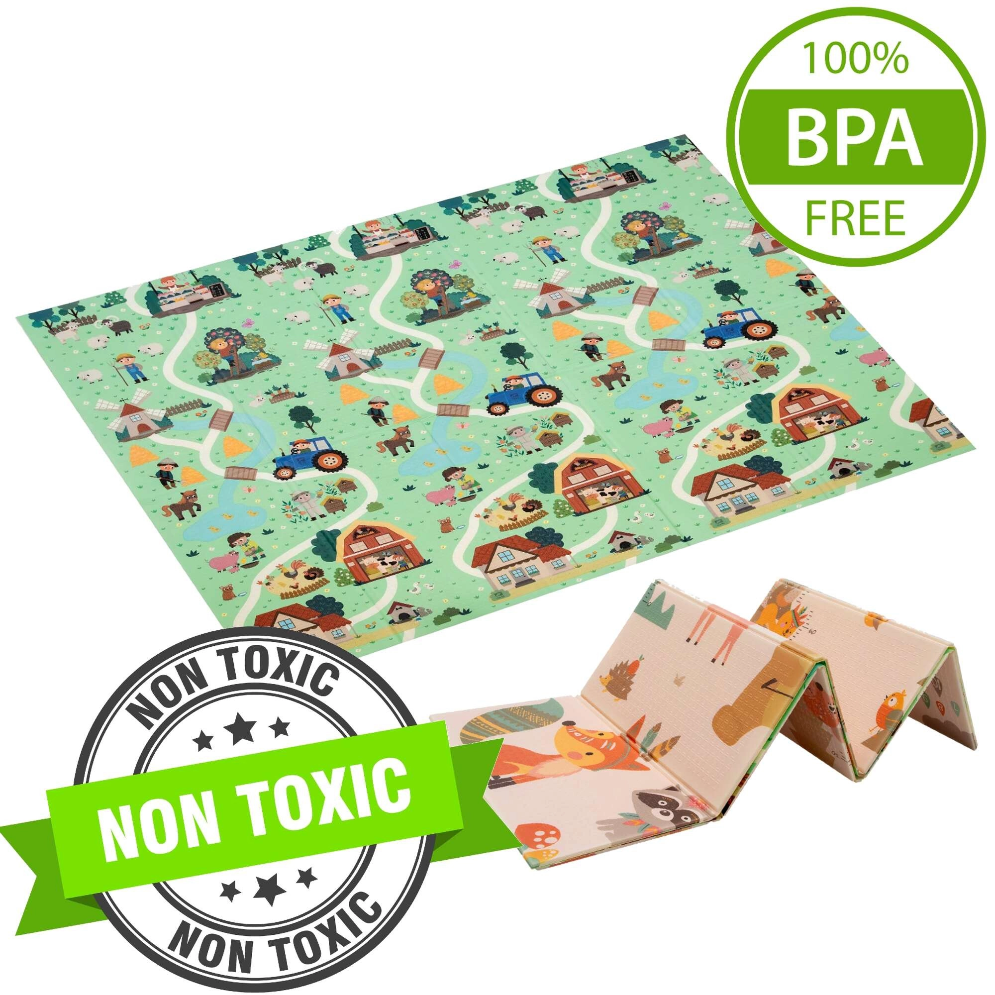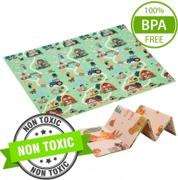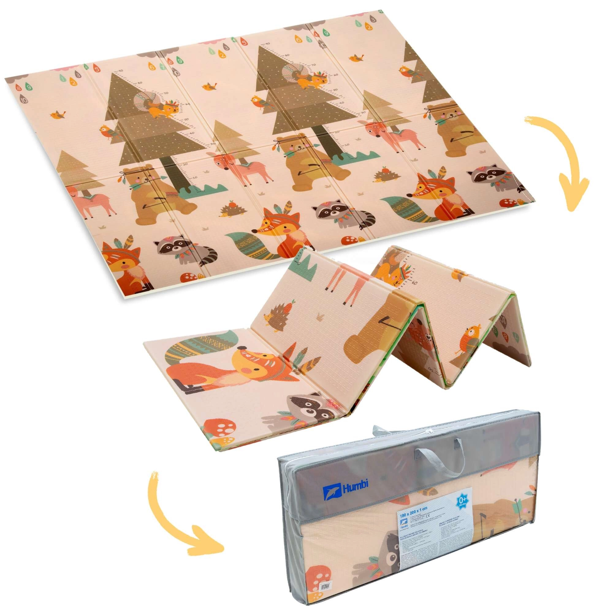 De grote dubbelzijdige speelmat van XPE-schuim van het merk Humbi biedt kinderen vanaf de geboorte zacht comfort, veiligheid en uitstekende thermische isolatie. Dankzij de opvouwbare constructie en de meegeleverde draagtas berg je haar gemakkelijk op en neem je haar overal mee naartoe. Ze is waterdicht, makkelijk schoon te maken, vrij van schadelijke stoffen en biedt twee aantrekkelijke educatieve zijden: bosdieren en dorpsthema’s met wegen voor plezier en het stimuleren van de fantasie.
