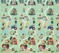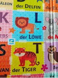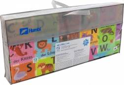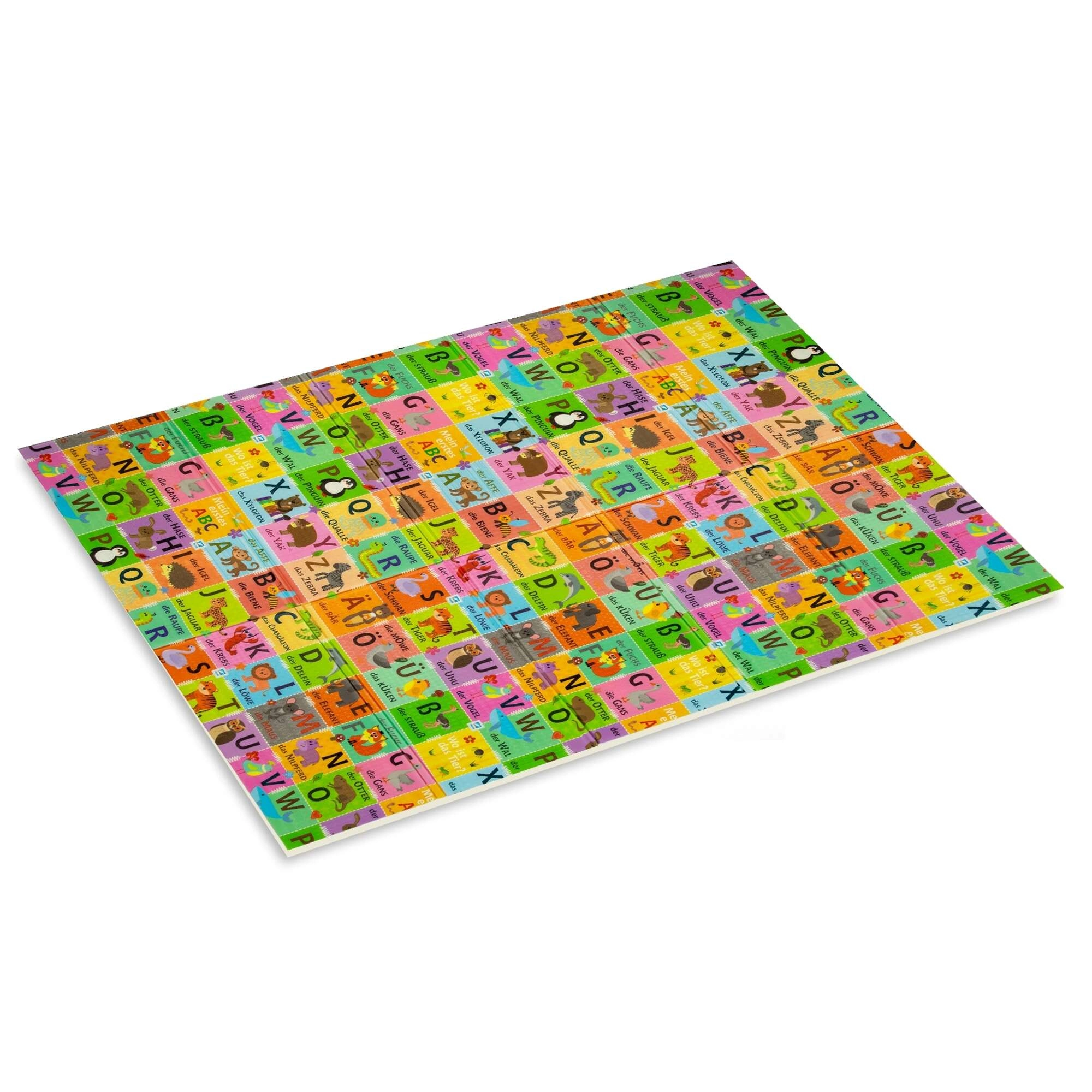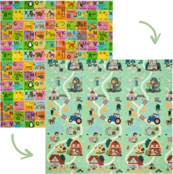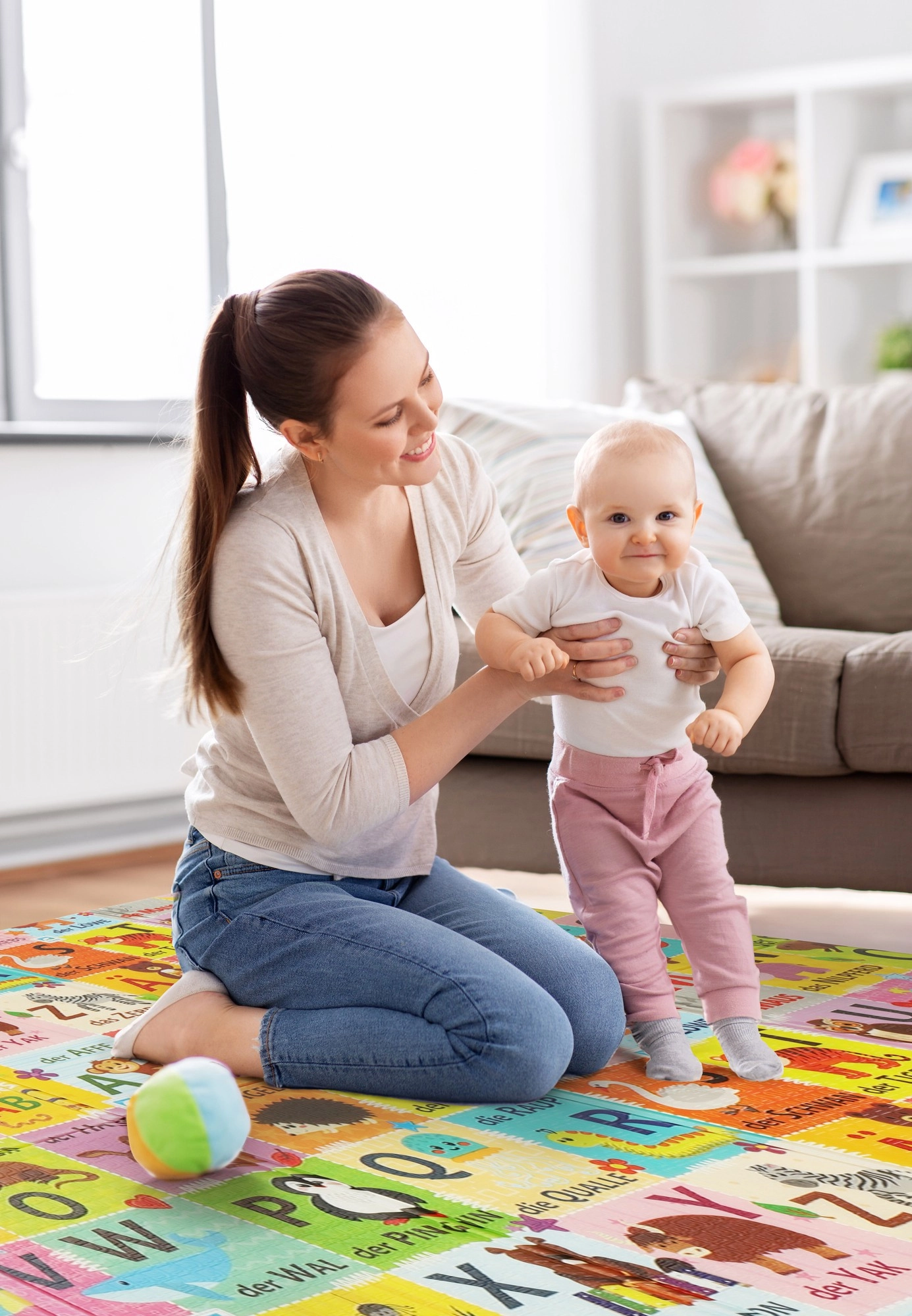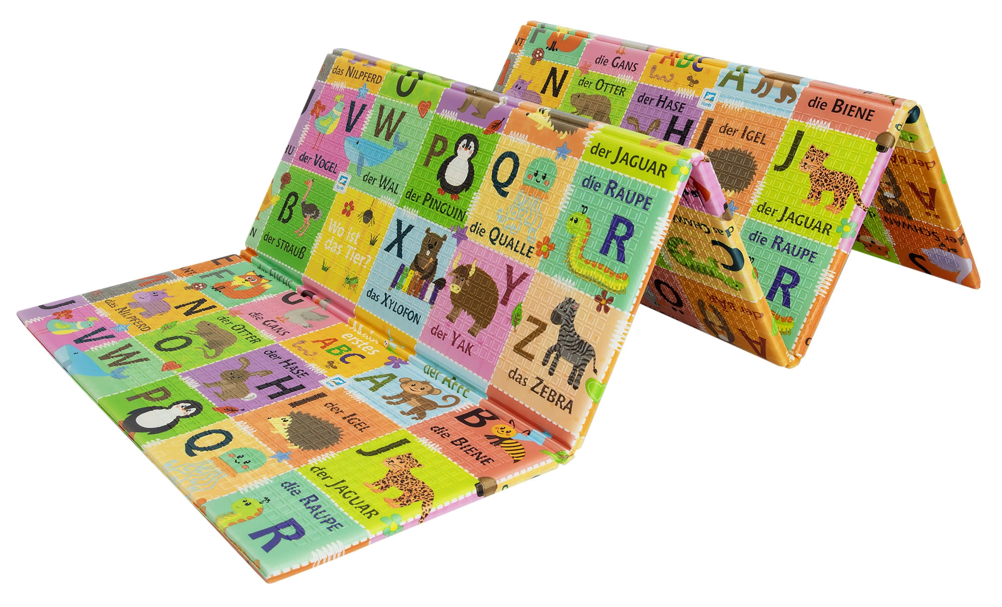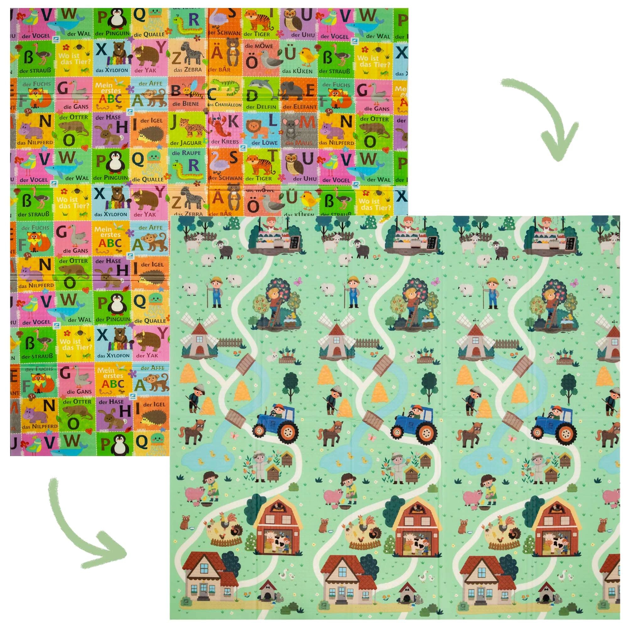 Twee zijden met educatieve graphics stimuleren vroeg leren: de ene toont het Duitse alfabet met dieren, de andere een scène van het leven op het platteland. Dankzij het antislip subtiel reliëfoppervlak is hij veilig voor kruipen en lopen en stimuleert hij de zintuiglijke ontwikkeling.