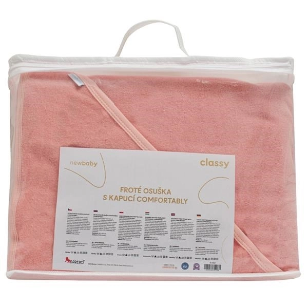 Zachte en fijne kinderhanddoek met capuchon NEW BABY Comfortably die zowel baby’s als grotere kinderen zal bevallen. Gemaakt van 100% katoenen badstof, die zeer absorberend, sneldrogend en vriendelijk voor de gevoelige huid is. De praktische capuchon beschermt het hoofdje tegen kou en de dubbellaagse uitvoering zorgt voor betere warmte en comfort na het baden.