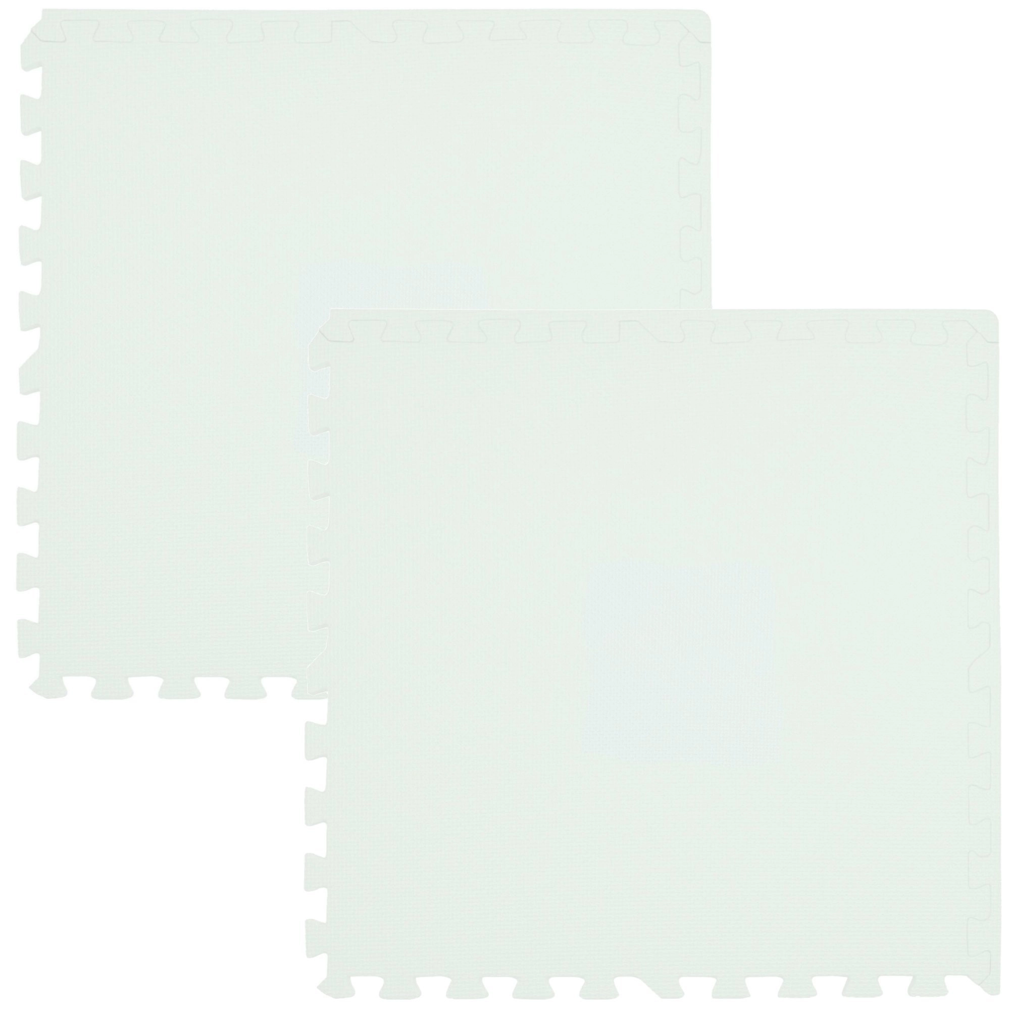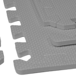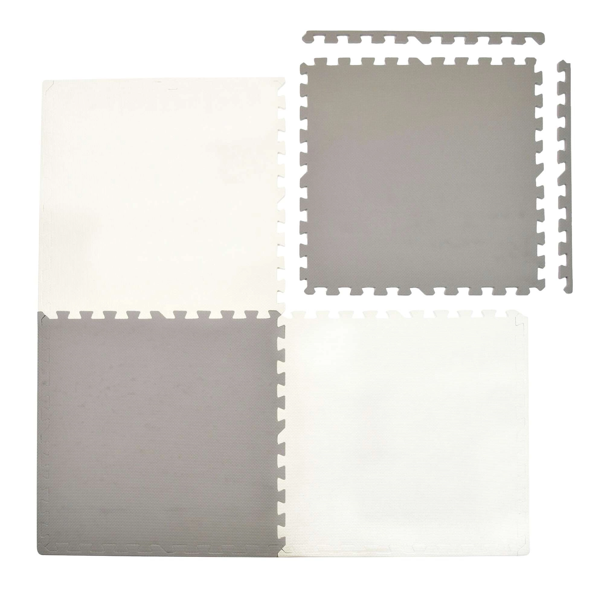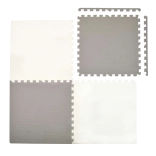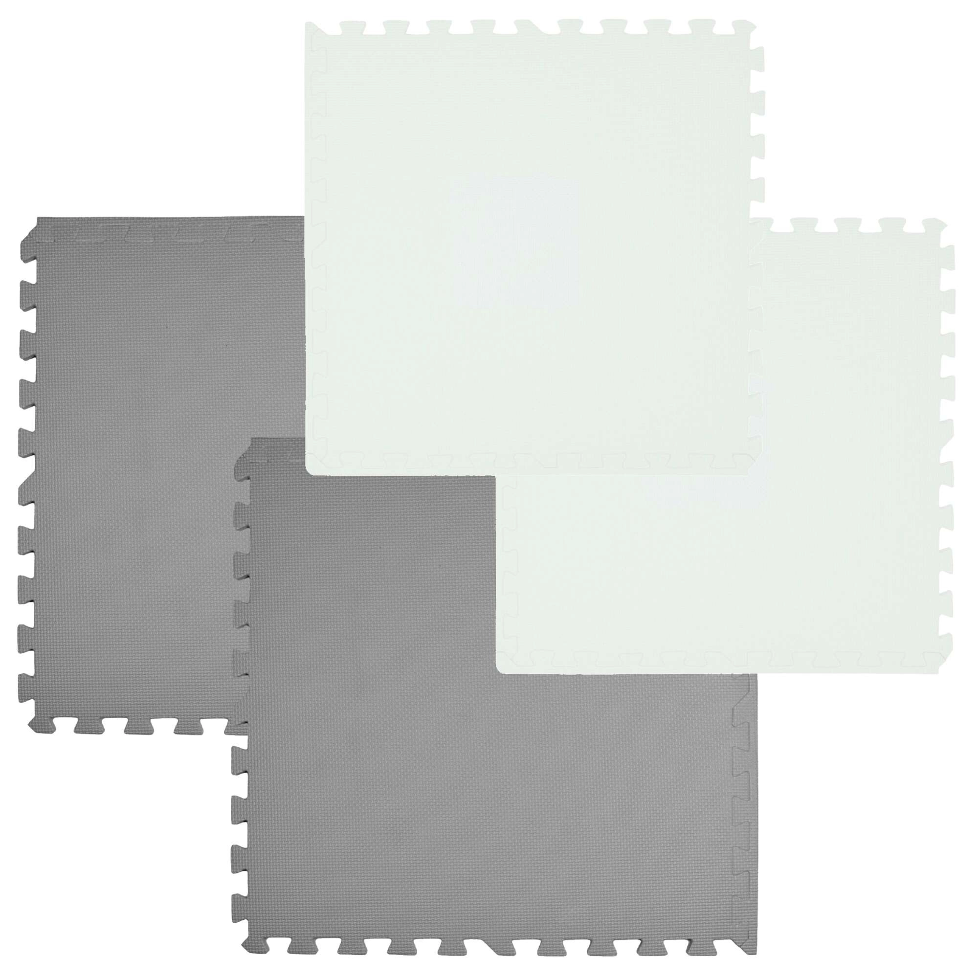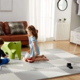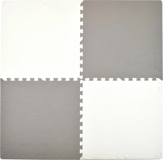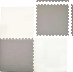 Praktische kinderspeelmat van EVA-schuim, opgebouwd uit grote puzzelstukken, creëert een zachte, veilige en antislip speelplek om te spelen, kruipen en de eerste stapjes te zetten. Set van 4 tegels van 60 × 60 cm met randen, eenvoudig te leggen tot een formaat van 120 × 120 × 1 cm; tegels zijn koppelbaar en uitbreidbaar met extra sets. De mat is waterdicht, isoleert tegen kou vanaf de vloer, absorteert schokken en is makkelijk schoon te maken met een doekje.