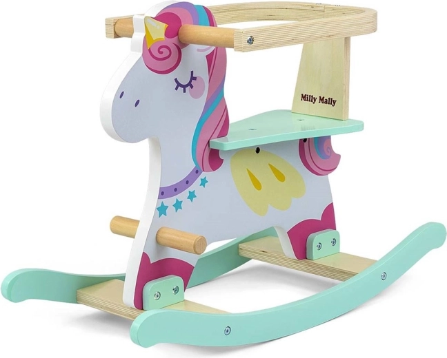De houten schommelpony in de vorm van een eenhoorn, Lucky, maakt elke kleine rijder blij. Nauwkeurige afwerking van MDF en multiplex, geprofileerde latten voor soepel schommelen en praktische voetsteunen zorgen voor een veilige en comfortabele beweging. Pasteltinten, aangebracht met niet-giftige verven, en speelse details vullen de kinderkamer prachtig aan.