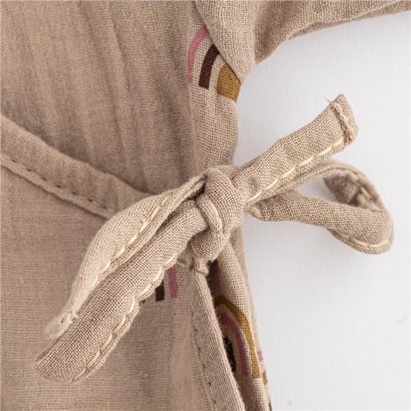De praktische overslagstijl met zijknoopbinding maakt het mogelijk je baby aan te kleden zonder onnodig over het hoofd te trekken. De sluiting onderaan met drukknoopjes vereenvoudigt het verschonen. Mousseline van 100% katoen is bovendien bestand tegen frequent wassen en wordt na verloop van tijd nog zachter, waardoor je er snel dol op wordt.