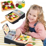 De bodem is verdeeld in 4 stukken voor eenvoudig portioneren en rollenspel met serveren. De stevige, kleurrijke toppings liggen goed in kleine handjes en ondersteunen de fijne motoriek.